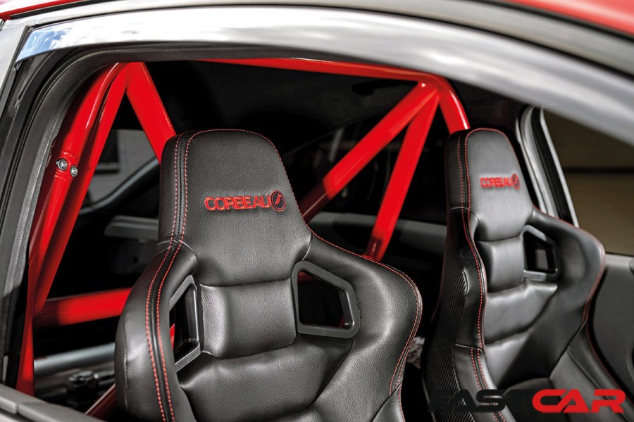 The car was getting a great reception at the shows, and John was keen to get the interior as match-fit as the rest of the car, so he set about sourcing a pair of Corbeau Sportline RRS seats and having some custom red stitching done. And it was at this point that the 2000s nostalgia really kicked in. What better way to showcase a fancy new set of seats than with a pair of Lambo-style scissor doors?