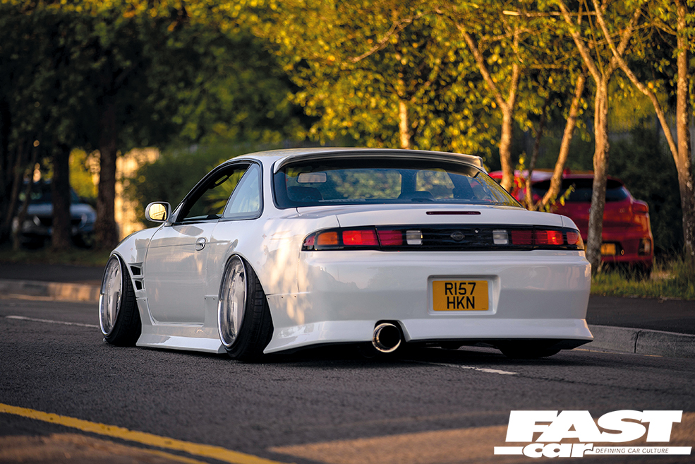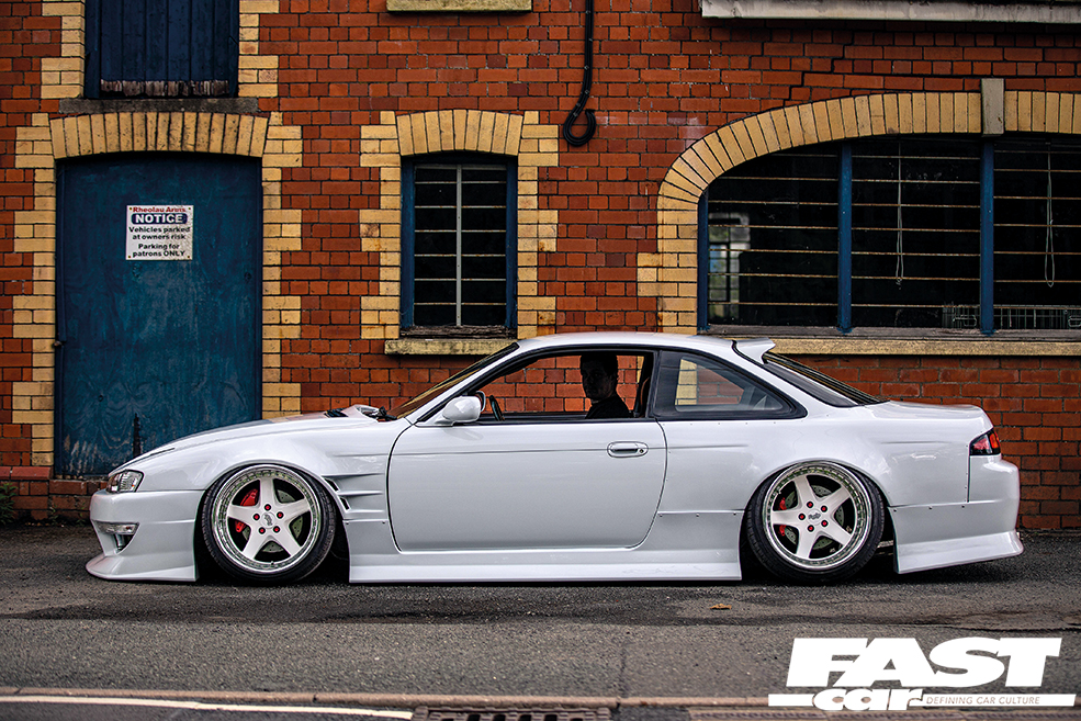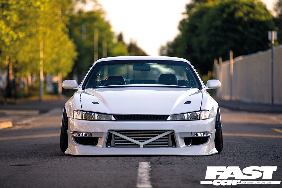 “The car’s had many looks over the last two years of owning it,” he says. “It didn’t take long to start the stance look after I crashed it into a kerb, that was when the changes really began to happen! I took the car to my mate Axel Richardson and he cut all the rot out and replaced it, as he’s a been building S14s for many years. He also tubbed it so I could fit 18s without mega amounts of camber.”