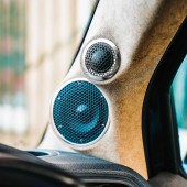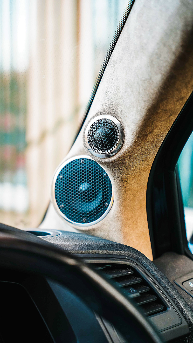 Rainbow Profi 3-way active front end utilising Plush Automotive designed 3D printed mid bass on axis door mounts, bespoke A pillar builds, Rainbow 10” Profi up front centre sub housed in a custom centre enclosure, Audison Bit One HD processor, Audison thesis 4 channel Amplifiers (x2)