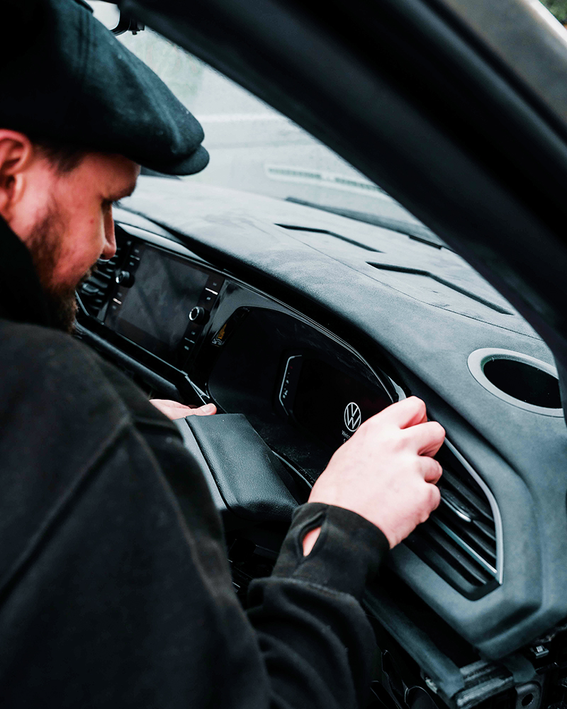 The ‘next levelness’ continues in the cab area where, rather than simply painting the cream plastics that were not sitting well with Luke’s eye, he took a different approach. “I didn’t like the thought of the paint chipping or getting scratched which is very likely to happen with all the movement around the cab getting in and out,” he says. “Instead, we started the mammoth task of cross-referencing other VW parts that had OEM black fixings such as the seat belt buckles and grab handles. We even went to the extent of buying black Audi sunvisors and grafting an OEM mirror into the bagged VW T6 sun visors before trimming.” A touch of madness.