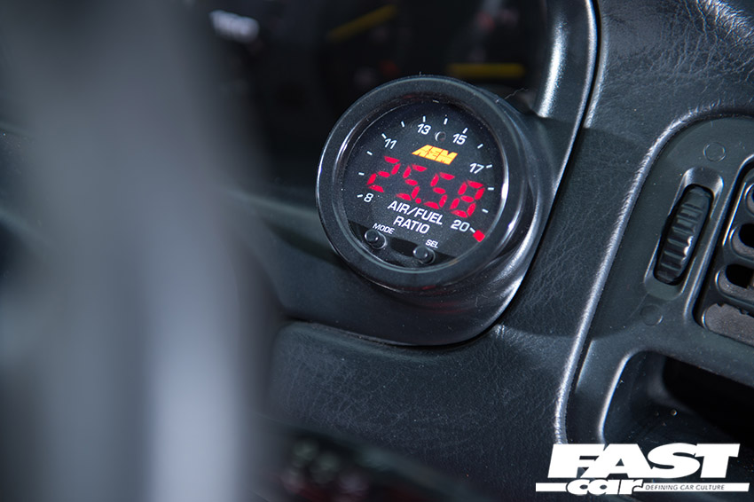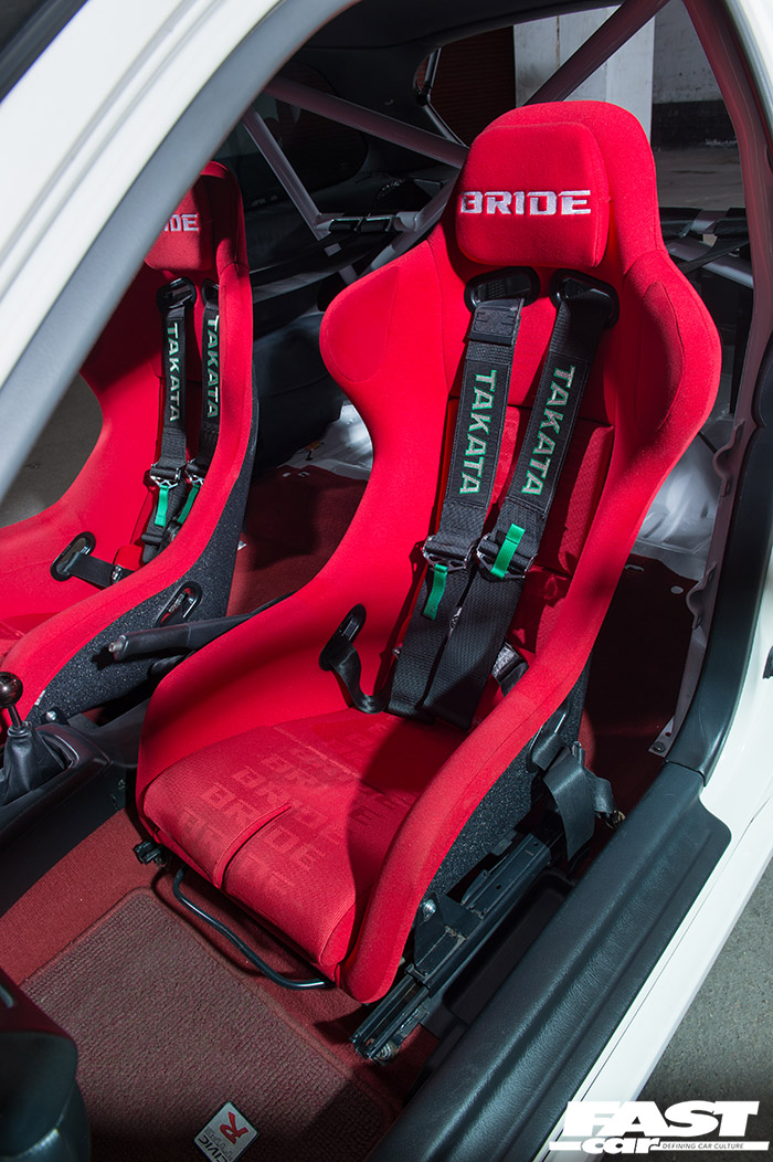 Bride Zeta III seats, Takata Black 4-point harnesses, Nardi Deep Corn Black suede steering wheel with red stitching, NRG snap-off boss, Safety Devices half-’cage, APEX’i AVC-R boost controller, AEM oil pressure gauge, AEM wideband AFR gauge
