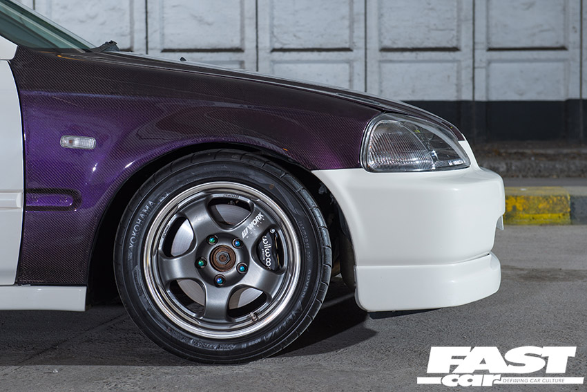 Championship White EK9, carbon fiber bonnet and front wings lacquered with purple flake