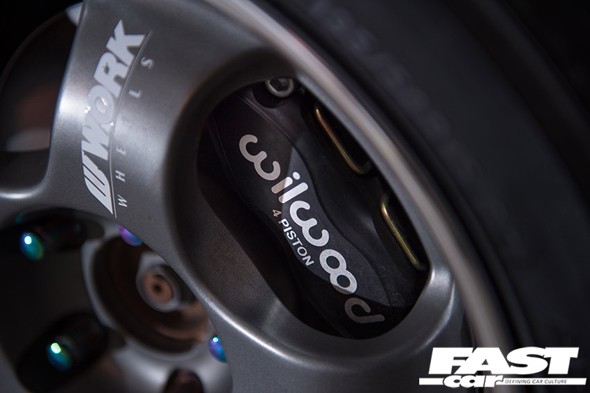 7×15-inch WORK Meister S1 2-piece wheels – gunmetal grey with polished lips (ET35 R-disk front, ET40 A-disk rear), 195/50 Yokohama Advan Neova AD08R tires, MeisterR Zeta-CRD coilovers, Wilwood Midilite 4-pot brakes, braided lines