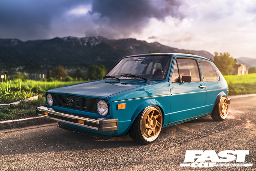 The custom dash gleams with the stuff, with its integrated Air Lift controller and MOD7E digi-dash; the rollcage is carbon, the doorcards, the door handles, the door catches themselves, the caps on the Viair compressors, it’s an all-out visual assault. Carbon may be the fourth most abundant element in the universe, but Gabriel’s caricaturized the globe here – it’s the most abundant element in his Golf by quite some margin.