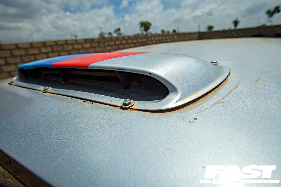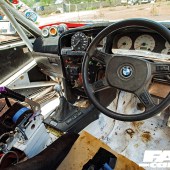 The chassis was seam welded and extra engine cooling added, with an additional pipe leading straight to the intake of the straight-six engine, as for the first few rallies they ran with the original M20B25. With the car standing 5” higher than normal, a set of 205/65 Dunlop Motorsport Direzza 87R tyres mounted on steelies could be fitted but the rears stuck out past the bodywork, so the arches had to be extended to accommodate them. Cue tin snips, a big hammer and lots of body filler. To funnel air into the cabin an Impreza bonnet scoop covers a roughly-cut hole in the roof… Yet, surprisingly, everything else is stock 1987 BMW. The interior too is purely functional. Loose wires hang out of the dashboard and, because of the new engine, the only things in the dashboard that work are the speedo extracted from the Evo, wedged into the air vent, and the oil pressure light. Meanwhile, a makeshift switchboard is housed in the lower dash valence.