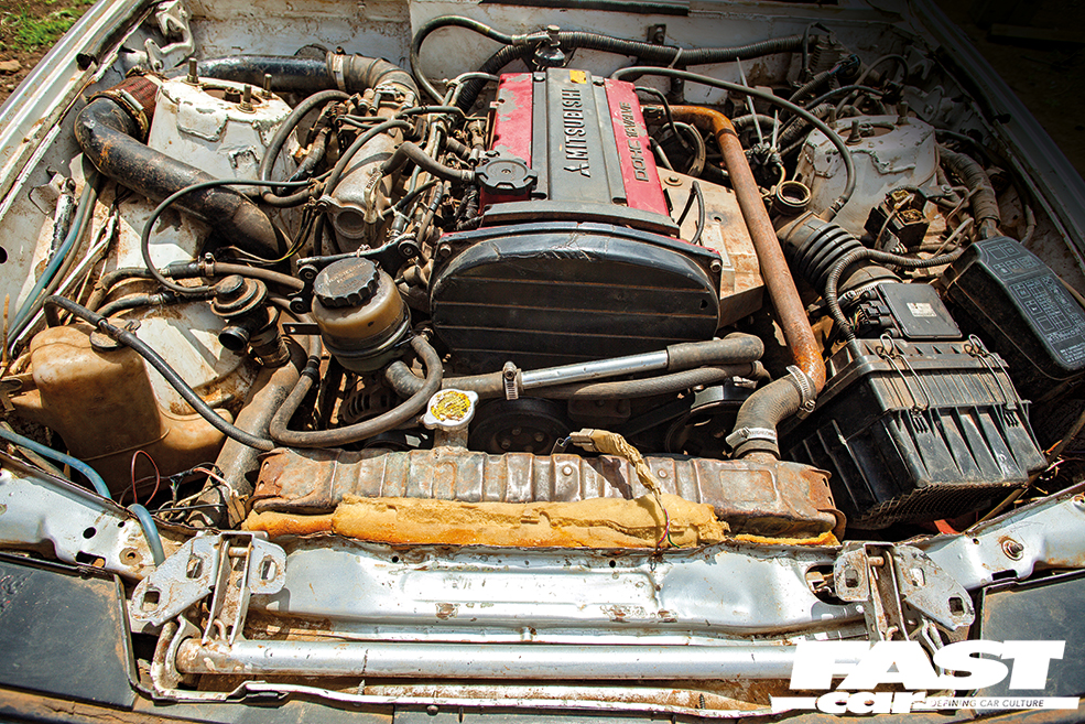 2.0-litre four cylinder single-turbo 4G63T, custom straight-through exhaust system. Getrag 260 five-speed manual, welded diff