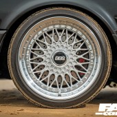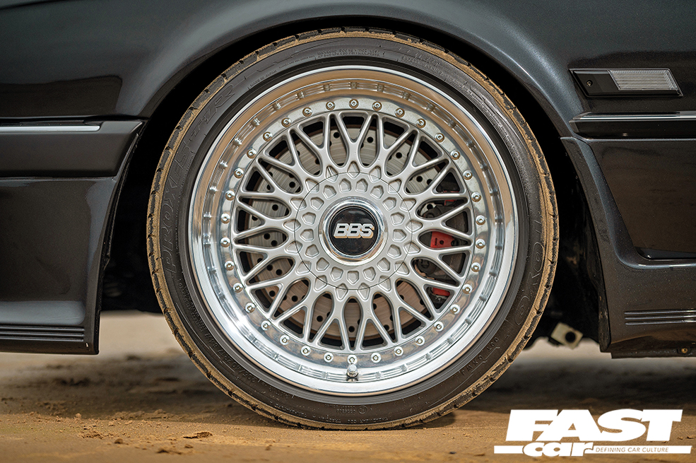 8×17” (front) and 9×17” (rear) BBS Style 5 wheels with 205/40 (front) and 215/40 (rear) tyres, modified front subframe, E36 M3 Evo front hubs and lower arms, E36 Compact rear end, E36 HSD fully adjustable coilovers, E46 M3 brake conversion