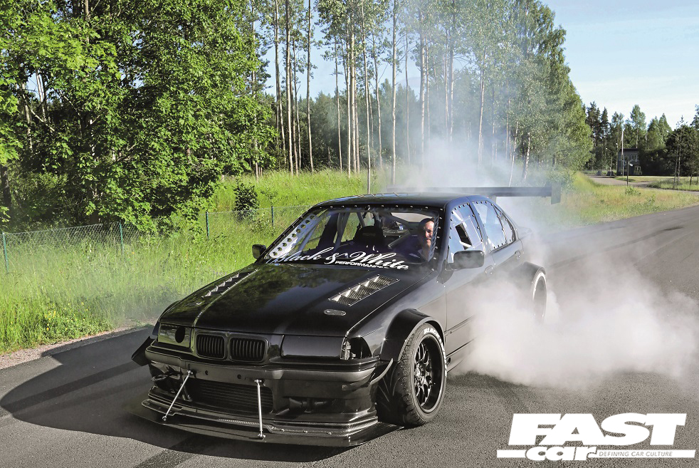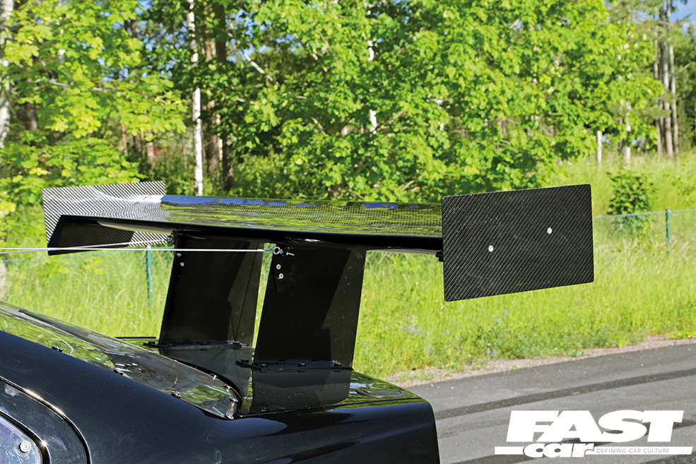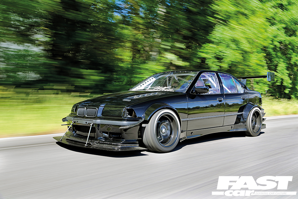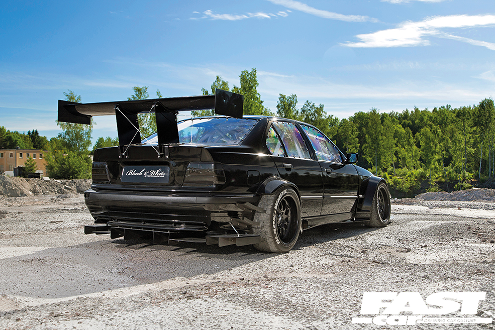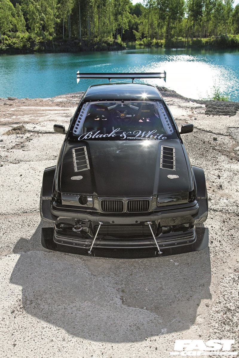 “There were no problems building the components but I have had some problems with the big front as it takes a lot of pressure and I broke the mounts,” says Andreas. “The entire front is mounted together so that it can be removed quickly using five push click mounts, and the cooling package is mounted together so it can be removed in a few minutes as well. The exterior is made to be really aggressive but it also works with a lot of downforce – below 200km/h (124mph) I have full grip on normal cheap street tyres and that’s running at full power,” he grins, which is seriously impressive stuff. As for his vision of creating a really wide and angry-looking boosted BMW E36, it’s mission accomplished as this machine is visually terrifying. It’s black on black on black, with that black bodywork enhanced by those custom-made pumped-up arches, blacked-out front and rear lights, black wheels and then there’s all that carbon and those outrageously angular aero elements. Cars really don’t get much more intimidating and aggressive than this.