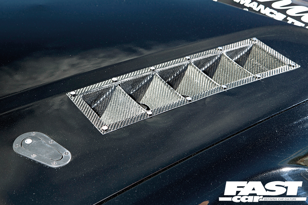 Custom wide arches, fibreglass bonnet with carbon vents, fibreglass boot lid, custom carbon wing, carbon canards front and rear, custom-made front splitter and rear diffuser to match wide-arches, bolt-in plastic windows, blacked-out head and rear lights, Benen IND towing hook