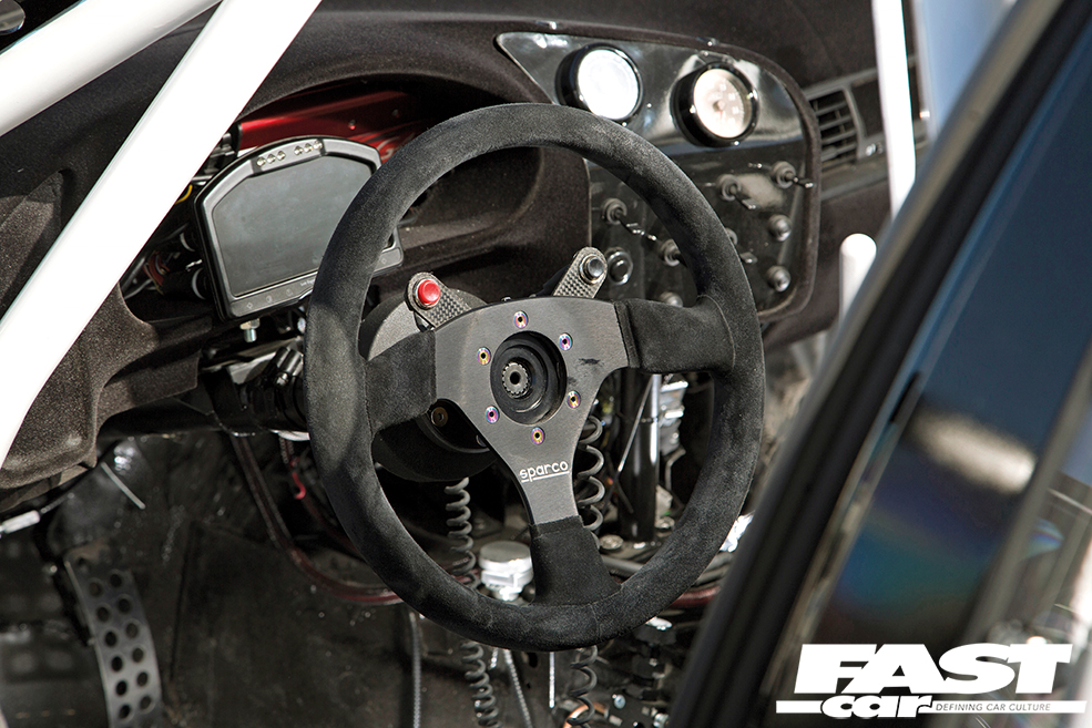 Fully-stripped, Group H rally cage, Momo seats, RRS four-point harnesses, Sparco steering wheel, Race Technology digital display, Innovate AFR gauge, AEM boost gauge, hydraulic handbrake, flocked dash