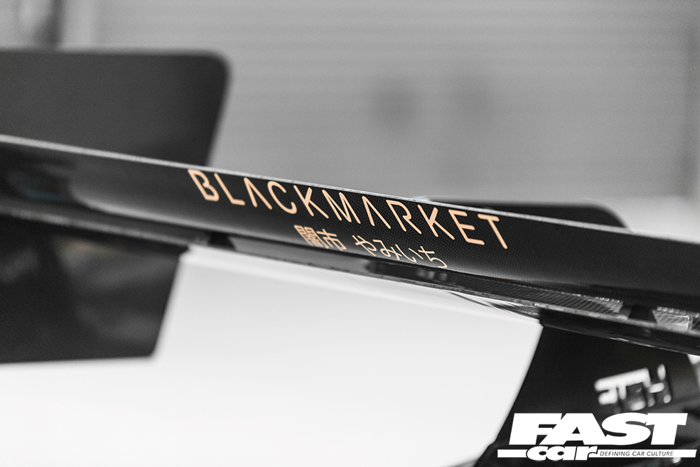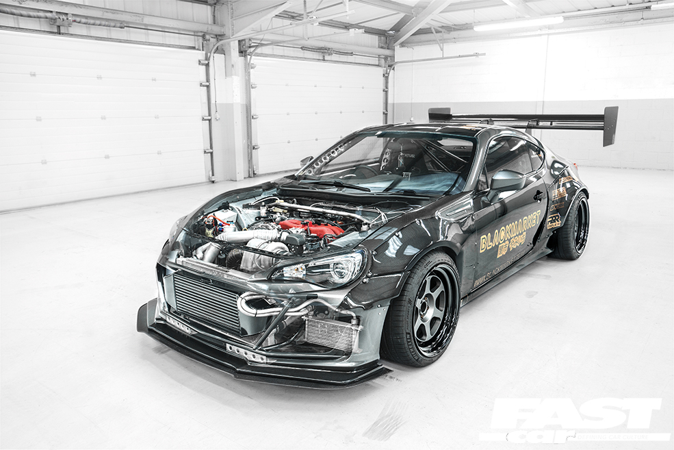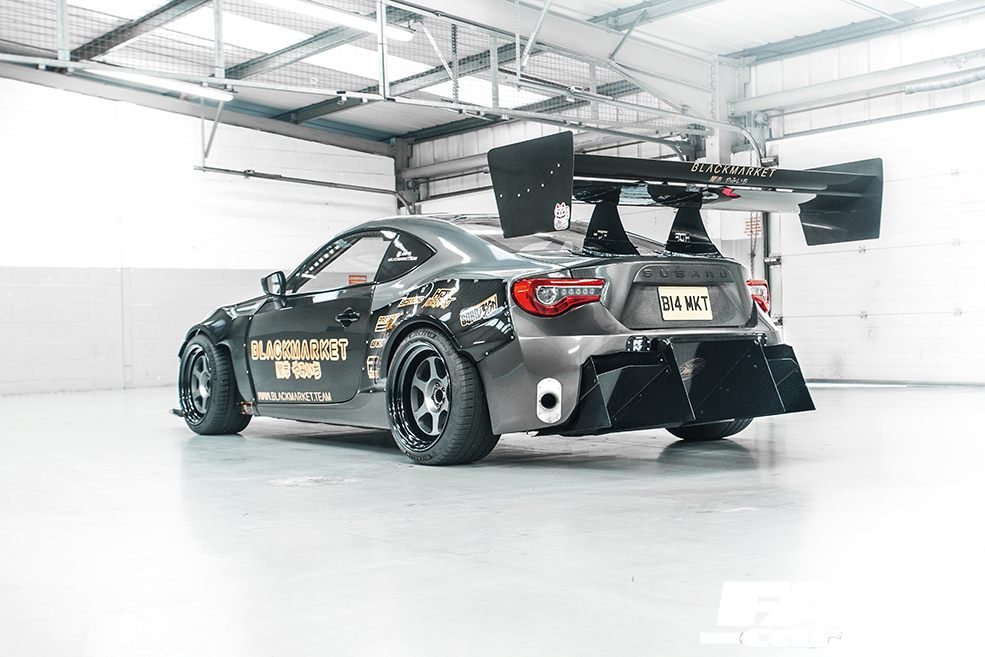 Syco Graphix Shark Grey wrap with BLACKMARKET livery, Fly1 Motorsports V1 wide-body kit, Marsh Composites / MPH Fab extended carbon splitter, carbon side window deletes, carbon GT bootlid and carbon GT bonnet, OEM 2017-facelift BRZ front bumper and taillights, APR 2017 carbon lip/airdam, Rigid Industries flush-mount Black Edition D-Series PRO spotlights, Carbon Composite Parts 1,900mm dual-element swan-neck rear wing with HDF Motorsport mounts, Seibon carbon doors, Seibon +10mm wings (cut to suit wide-body kit), HDF Motorsports rear diffuser, HDF Motorsport bootlid fixings, HDF Motorsport front bumper quick-release, Aerocatch bonnet catches