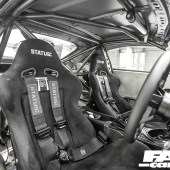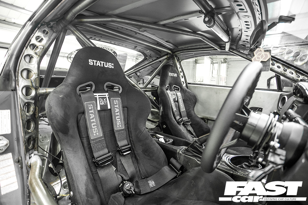 Fully stripped, HDF Motorsport custom TIG-welded rollcage (extended to suspension turrets, with D1-style door bars and harness bar), custom Status: Racing carbon Spa recliners with BLACKMARKET logos, Status: Racing black harnesses, Nardi Deep Corn steering wheel, NRG short-hub column adapter and Gen 3.0 quick-release, Planted Technologies seat brackets, IRB Speed aluminium door cards, Agency Power carbon centre console