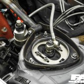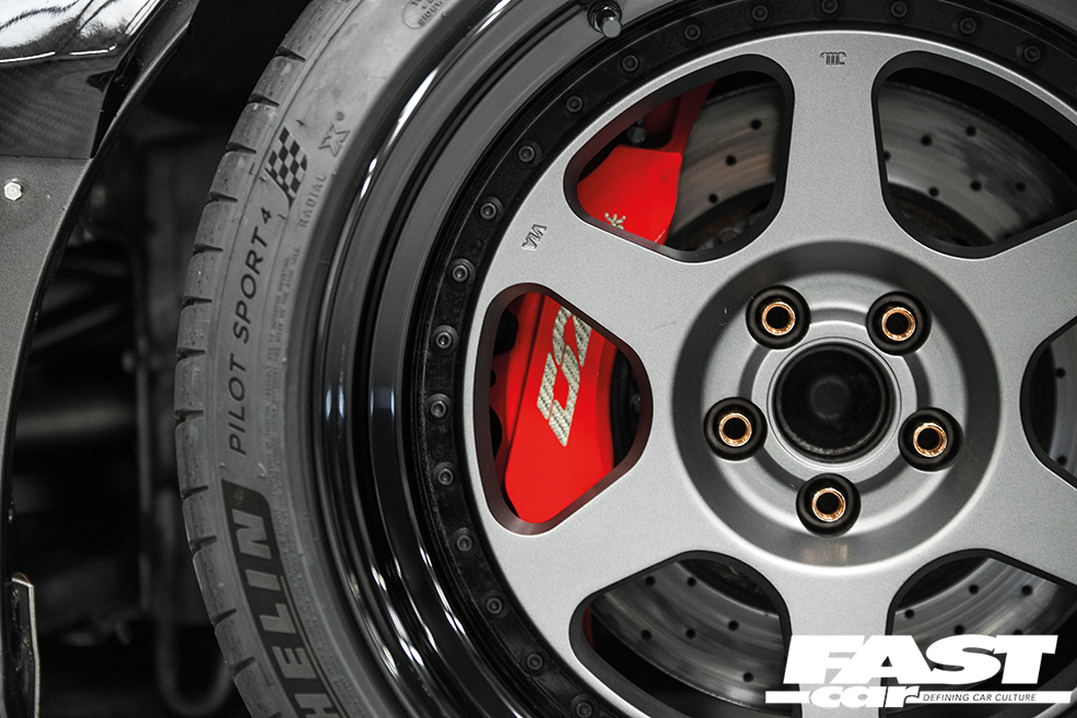 Peer past those fat WORK Meister L3 wheels and you’ll find a chassis positively brimming with race car prowess. BC Racing ZR remote-reservoir coilovers are joined by SPL adjustable rear LCAs, toe arms and traction arms, all crafted in lightweight titanium. The front end has been tube-framed and the arch tubs monkeyed about with, and the D2 BBK (6-pots at the front, 4-pots out back) is complemented by a full suite of braided brake lines – and that’s not just the easy-to-access ones, every single hose and hard-pipe has been replaced. The wheels themselves are also worthy of note, for their size alone. Unusually, the BRZ’s running a ‘square’ setup, with all four wheels packing the same dimensions: 11×18-inch, wrapped in 275/35 Michelin Pilot Sport 4 rubber. The secret to the fitment is all in the custom offsets – although we’ve been sworn to secrecy, as there were countless hours of R&D that went into making these hoops fit correctly and work effectively. Alan’s lips are sealed.