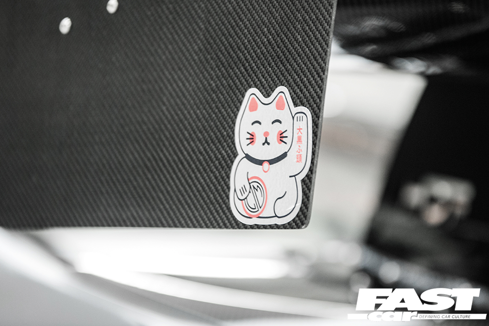 The interior is a place of pure function, not just with the rollcage, but by virtue of the fact that everything superfluous has been stripped out – soundproofing, airbags, the works – and Alan’s swapped in custom Status: Racing carbon Spa seats and harnesses, and of course the exterior means serious business. You can’t really miss that cartoonish rear wing (although it’s not as silly as some might think), and those long-held wide-body dreams have been fulfilled by the addition of a Fly1 Motorsports V1 wide-body kit working with customised Seibon carbon wings. Carbon fibre is something of a theme in fact, with Marsh Composites / MPH Fab providing the extended carbon splitter, side window deletes, GT bootlid and GT bonnet. Even the doors are carbon fibre! It’s attention to race-ready detail like this, along with custom touches like the HDF Motorsports rear diffuser, which proves just how serious Alan is about levelling-up to Time Attack one day. With that said, it’s clearly all the more impressive that this superlative