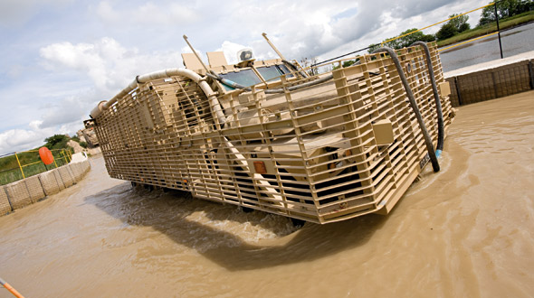 8m long, 3.2m high, 3.2m wide; motorised gun turret; 360-litre fuel tank; bullet proof glass; RPG resistant cage armour; bodywork (.50-cal proof) armour and lots of it; mine plow (optional).