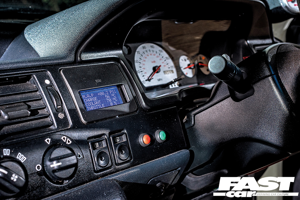 Helping to transmit the power to that aforementioned rear diff is a dog engagement-style version of the car’s factory H-pattern five-speed gearbox from Quaife; a no-nonsense unit with open gear faces that provides super-fast, aggressive shifts every time. Helping Adam to keep the car in check, a brace of chassis enhancements like GAZ coilovers and huge anti-roll bars do their best in keeping the car in the right direction.