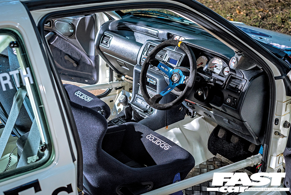 Under the bonnet, the boosted YB lump has been thoroughly updated, comprehensively re-worked by Dave Pritchard at DP Motorsport to now safely support around 530bhp on a reserved map setting. This has been achieved with oversized Ford Motorsport pistons in the block, as well as BD14 cams and Vernier pulleys in the head, all of which support the substantial GT3076R roller-bearing ‘charger that now so effortlessly supplies the boost. With plenty of other motorsport-inspired ancillaries also making an appearance (such as that wonderfully outrageous Group A side-exit exhaust system and trick fuelling setup), the car’s since made several pilgrimages over to PJ Motorsport to get its Level 8 ECU fettled to perfection.
