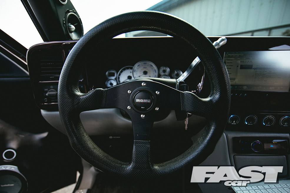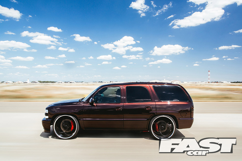 26in U2 55 rims; 10in wide; with Pirelli P Zero 295/25×26 tyres; 6-piston Wilwood brakes with 16 inch discs up front and 4-piston on 14.5 inch discs at the rear; RideTech Air suspension and Titanium shocks. DJM upper and lower control arms, McGaughys 2in drop spindles at the front, Spohn Performance upper and lower control arms to the rear plus Spohn adjustable panhard bar.