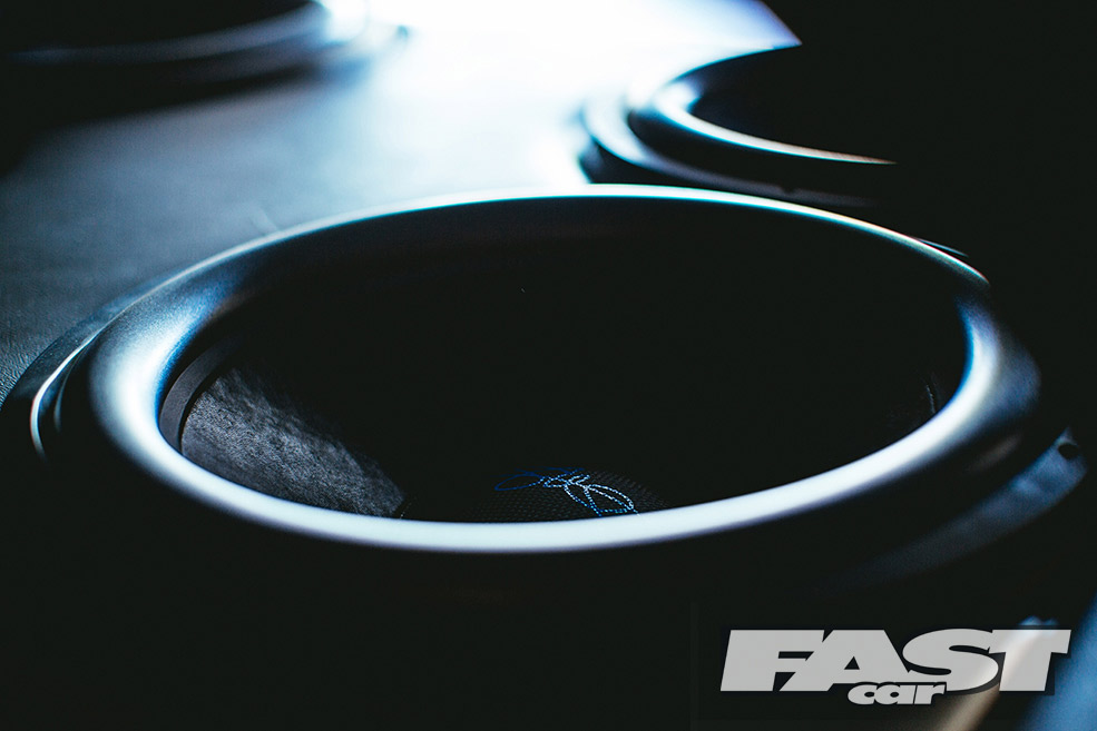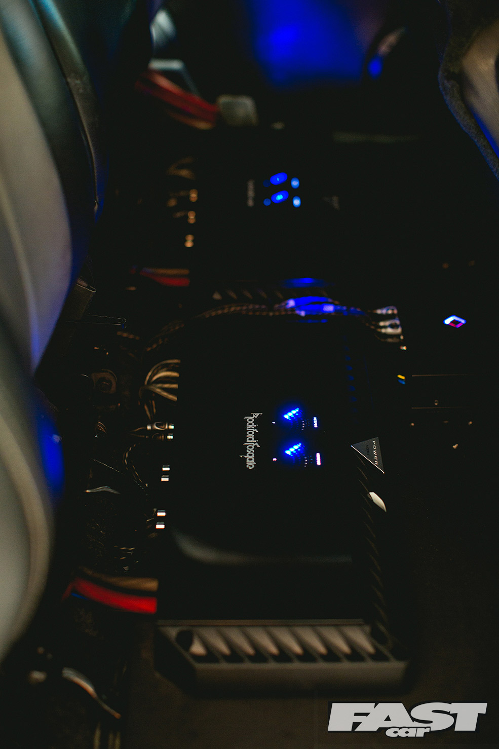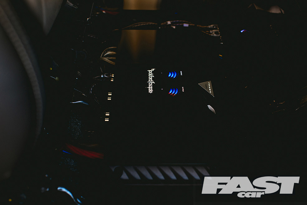 A Pioneer head unit acts as an extra source, but an Apple Mac mini with a 10.2 inch touchscreen is the main music provider in this kitted-out Chevy SUV. Steve uses a fibre optic TosLink Digital feed to stuff sounds into the Rockford Fosgate 360.3 processor. This has been out for around a year and offers a 31-band EQ for every speaker in the car as well as full digital signal processing (DSP).