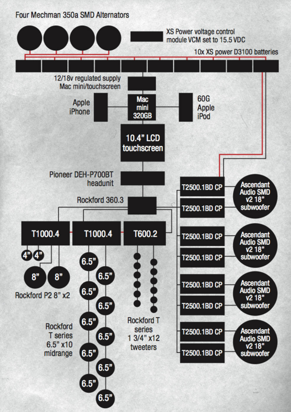 Pioneer DEH-P7000BT headunit; Apple 320GB Mac mini; 60GB iPod Classic; iPhone; 10.4 LCD TFTin touchscreen; Rockford Fosgate 360.3 EQ/Cossover; 2x Rockford Fosgate T-1000.4AD (4x250w RMS), 1x T-600.2 (2x300W RMS); 8x RF T-2500.1BDCP (1x 2,500w RMS at any impedance); 4x18in SMD Ascendant Audio V2 subwoofers; 12x 1.75in T1 tweeters; 10x 6.5in midranges; 2x 4in midranges; 2x 8in in the front doors; 28x runs of 2/0 & 1/0 AWG power cables to heavy-duty copper busbars to connect to the power amplifiers; 10x super-duty 80lb weight XS Power D3100 batteries (one in the engine bay and nine in the back); 4x Mechman SMD- spec 375 Amperes alternators.