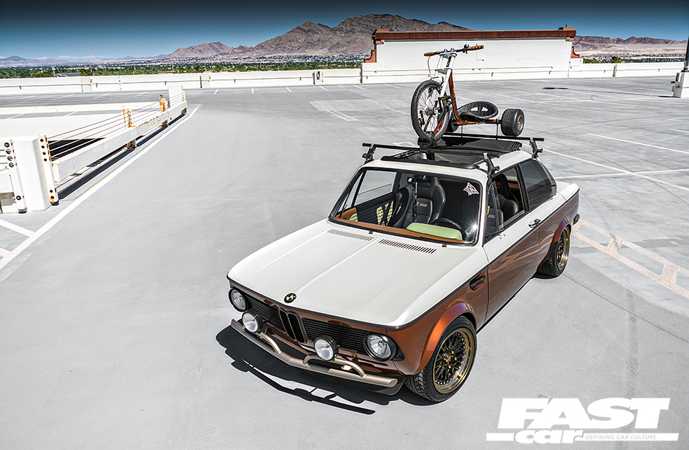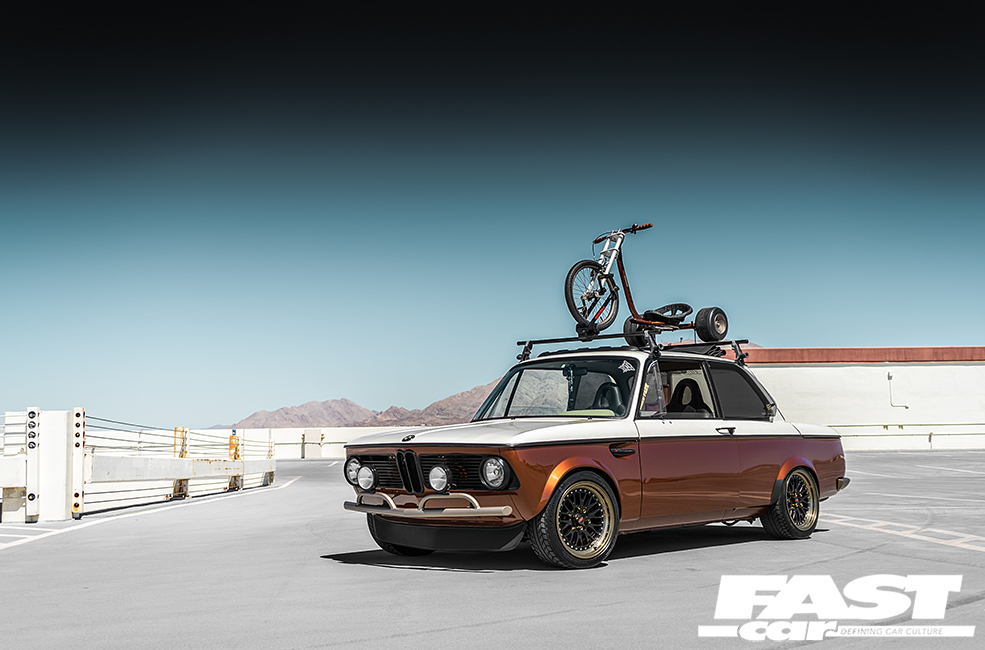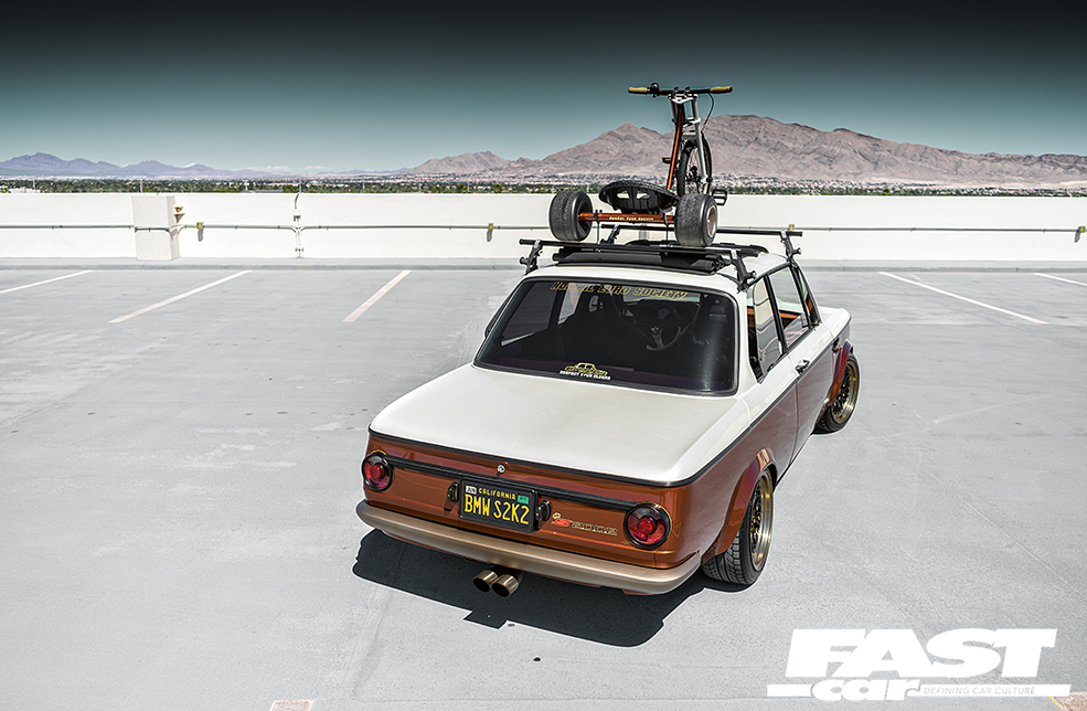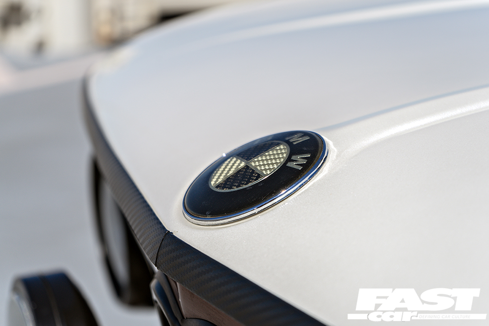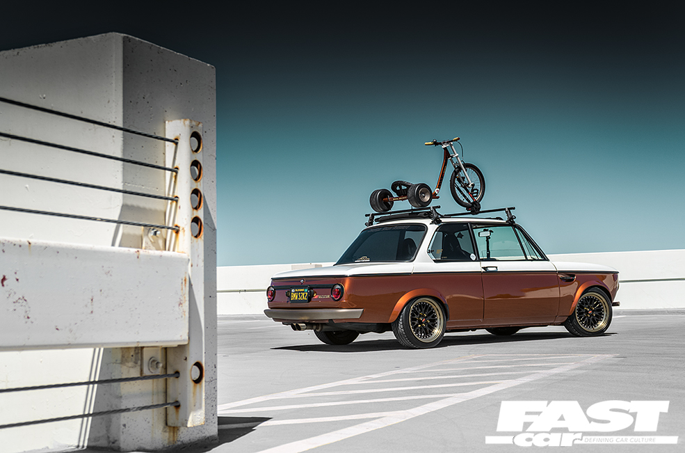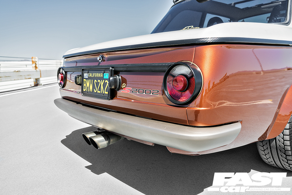 With Dan’s extensive bodywork restoration came the comprehensive transformation of this 2002’s styling and there’s so much to take in and enjoy here. We absolutely love the two-tone paint, so unconventional and unusual but the 2002’s design lends itself perfectly to splitting top and bottom halves; the combination of Pear White and Root Beer Brown makes the car itself look like a frothy beverage and that brown is just so rich and luscious and absolutely comes alive in the California sun. There’s a lot more than just the paint that sets this 2002 apart from the crowed and everywhere you look you unearth yet more hidden design touches. The moulded wheel arch flares give the diminutive ’02 a pumped-up look while the carbon E9x M3 wing vents and side repeaters work better than they really have any right to and blend perfectly with the rest of the car’s styling. Beneath the roof-mounted, colour-matched two-tone trike you can just spot the sliding roof that’s been installed and sitting between the white top and brown bottom is a carbon trim strip with further carbon detailing on the bonnet roundel and rear panel. We also love that front bumper bar, complete with spot lights, which just finishes the whole exterior off.