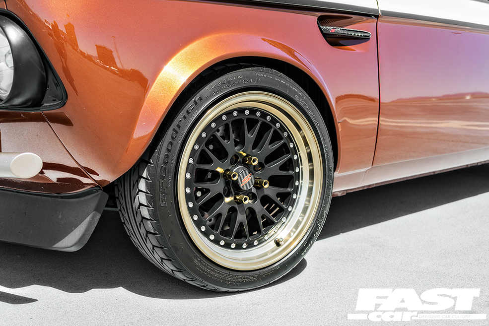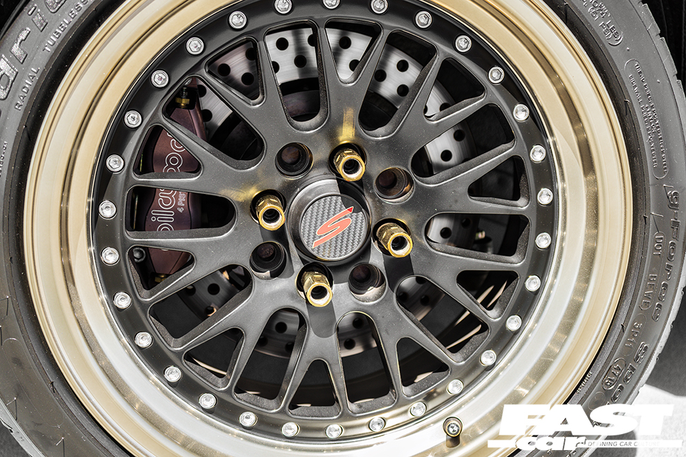 Of course, while the engine swap itself is extremely impressive, going by the rest of this build you know that Dan couldn’t simply have left it at that and the chassis has also been attended to, ensuring he’s got the whole package to enjoy because this car is most definitely not all about looks. On the suspension front you will find a combination of Bilstein shocks and sport lowering springs, which deliver a pretty serious drop and get those fat little arches hunkered right down over the tyres to great effect. The wheels are AV-12s by Avid 1, 8x16s all-round finished in two-tone black and bronze and it’s a colour combo that works really well with the car’s paintwork and a design that suits it perfectly, the classic cross-spoke look working so well here. But that’s not all; peer through their tight mesh and you might just spot the beefy Wilwood calipers that have been fitted all-round lurking behind the wheels, complete with drilled discs, endowing this pocket rocket with some seriously impressive stopping power. We weren’t kidding when we said this 2002 is the complete package.