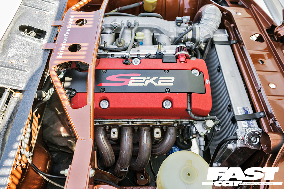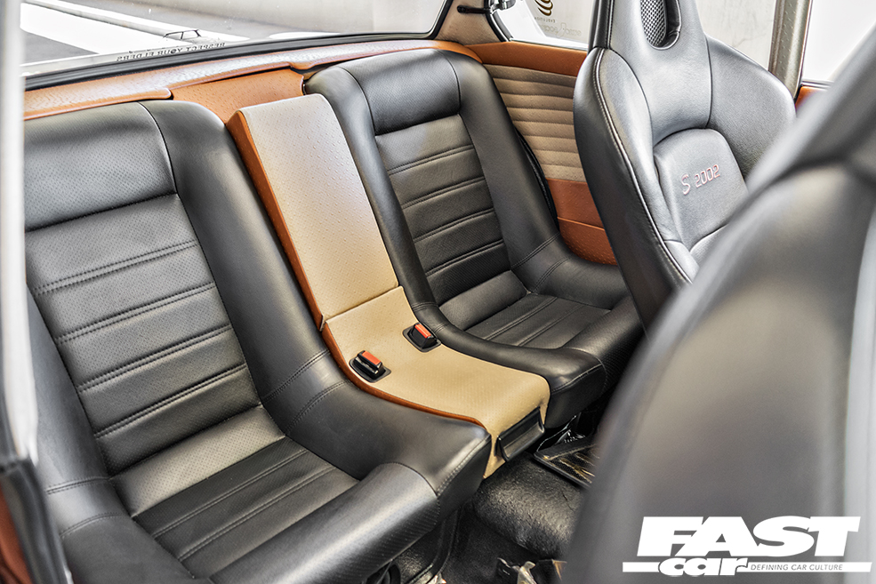 The interior, meanwhile, is an absolute riot and the amount of work that’s gone into it is absolutely mind-blowing. Everything in here is either completely custom or has been transplanted from the S2000 that gave its engine for this project and it all works incredibly well and looks absolutely fantastic. What you immediately notice is that wild leather and the dash, door panels and rear side panels have all been covered in ostrich leather. Yup, genuine ostrich leather, which has been given the same two-tone treatment as the paintwork. Up front you’ll find S2000 seats that have been re-trimmed in black leather while in the back are a pair of custom bucket seats from an E24 635CSi, also trimmed in fresh black hide and new black carpets have been fitted throughout. The carbon and perforated leather steering wheel carries over the carbon theme into the interior while the S2000’s digi-dash is framed by carbon and pale ostrich leather in a custom pod, complete with engine start button. For such a small interior, the amount of work that’s gone into it is amazing and the results are really astonishing, and that’s something you can’t argue with regardless of your stance on ostrich leather. Even the boot floor has been trimmed in pale ostrich leather while the boot-mounted rear brace and battery cage has been finished in Root Beer Brown; that’s the level of attention to detail that has been lavished upon this build and it really helps elevate it to the next level.
