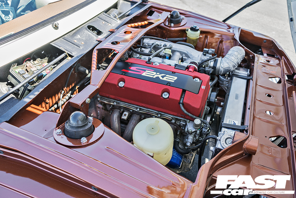 Up to now we can’t imagine you haven’t been enjoying this build but now we reach what might well be the bone of contention, that being what you’ll find lurking beneath the white bonnet, within that immaculately-finished, Root Beer Brown engine bay. “My engine choice was to use a Honda S2000 F20C with the matching Honda six-speed manual transmission,” says Dan. “I had access to the parts to perform this conversion, that is partly why I chose to do it. Also I intend to add a turbo soon which will help this engine produce in excess of 350hp and the parts are readily available and somewhat affordable,” he adds, which will be nice. Or rather nicer, we should say, because even with the almost entirely stock F20C four-cylinder engine mounted up front, Dan still gets to enjoy 237hp and an 8800rpm redline, which must make driving this firecracker of a 2002 an awesome experience. The engine bay itself is gorgeous, with minimal clutter to really show off that alien power plant, with its tubular exhaust manifold and intricate custom air intake piping.