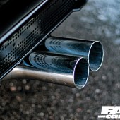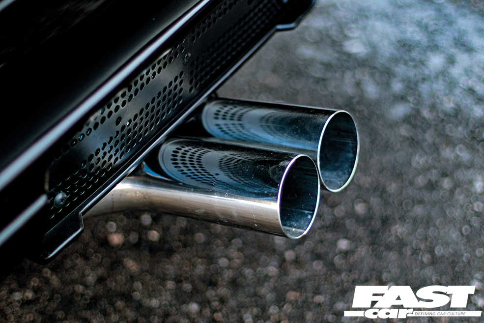 The arches are actually surprisingly subtle and look so good you’d assume the car came out of the factory looking like this if you didn’t know any better, while it’s that massive aluminium front spoiler and wing that give this car its Mad Max look and we love how they contrast with the clean blackness of the rest of the build. The single headlights give the front end a clean look and Coffa has also tinted the front indicators and rear lights as well as adding a monochrome roundel at the back, and the rear end just looks badass with that custom twin centre-exit exhaust setup. There’s real attention to detail here, and it extends to the gold surrounds on the bolts that have been used to cover up the holes on top of the front wings that are now visible with no bonnet, and they tie in perfectly with the details on those wheels…