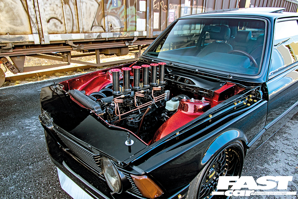When faced with a build of this scale it’s always kind of hard to know where to start so we might as well start where Coffa did, and that was with the engine. With its broken crank, it was in no fit state to provide any propulsion and so he pulled it out and set about rebuilding it, naturally, making it better in the process. “The engine is an M20B23 which has been stroked and bored to 2.7-litres. I added high-compression pistons, reduced the size of the combustion chambers in the cylinder head, added a Schrick camshaft and valve springs and Mira valve seats with an extra angle for better flow. I fitted triple Weber IDH 44mm carburettors with custom velocity stacks and I’ve also got custom-built exhaust manifolds, manufactured by Robert and Per Ajden,” says Coffa. That’s an impressive spec but the engine itself and the engine bay it sits in are truly spectacular. “Before mounting the engine, I cleaned up the engine bay by removing all unnecessary wiring, holes, mountings for reservoirs etc. then I painted it in a red candy colour over a gold flake base,” and the end result is awesome. The M20 itself has an air of steampunk about it, with those custom red-topped stacks and those beautifully wound copper fuel lines. The engine has been painted black while the exhaust manifold is a work of art and that combo of candy red over gold flake is just dazzling, while the short bonnet ensures everyone, everywhere can appreciate it. If this E21 makes a statement in itself, the engine is a statement on top of a statement and it’s a fitting centrepiece for this wild machine.
