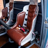 Custom alloy bomber seats (on floating frames) trimmed in weathered brown leather, hidden tubular rollcage, auxiliary gauges mounted to ’cage and trimmed in matching leather