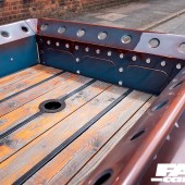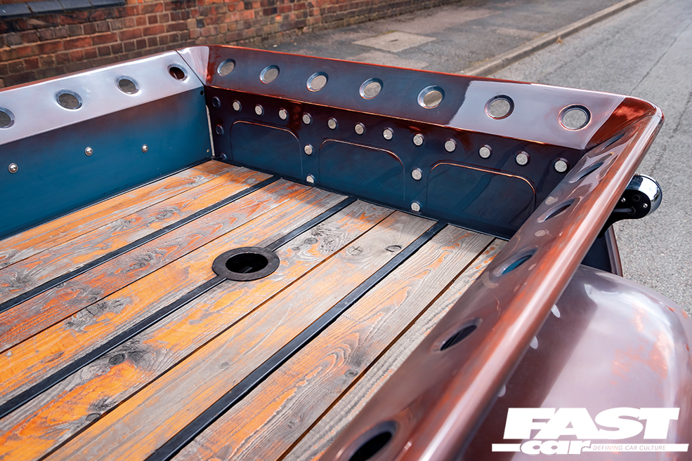 “The cab is now the only standard bit of bodywork remaining,” says Jack, at once energised and exhausted by the sheer amount of hard graft that’s gone into the makeover. “I stretched the bed by a foot as I love the look, then scratch-built the tailgate to keep the contours of the sides. I extended the side-steps to match the new bed length, and widened the arches front and rear by 2in, because tubbing is too easy! I wanted to keep a good-sized rear bed, and I knew I wanted a wide stance for the truck. For the front end, I built my own visor and added two teeth to the grille, then made the bonnet flip forwards and unbolt easily. And as you’ve probably spotted, I went a bit crazy with the dimple die all over the truck!”