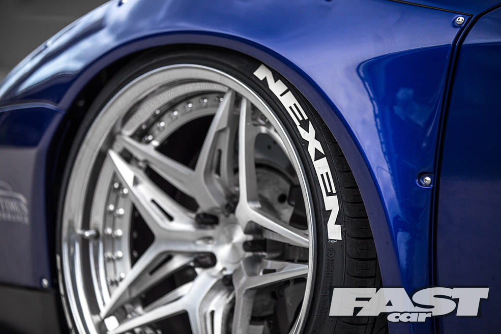 “The car was completely stripped down for the colour change,” he says. “It’s now in Ultrasonic Blue Mica paint with a custom pink pearl, as laid down by Wet Willie at Optimus Performance. And from there the AccuAir system was added; once all that was in place, the Liberty Walk V2 full carbon-fibre kit was painted and installed.”