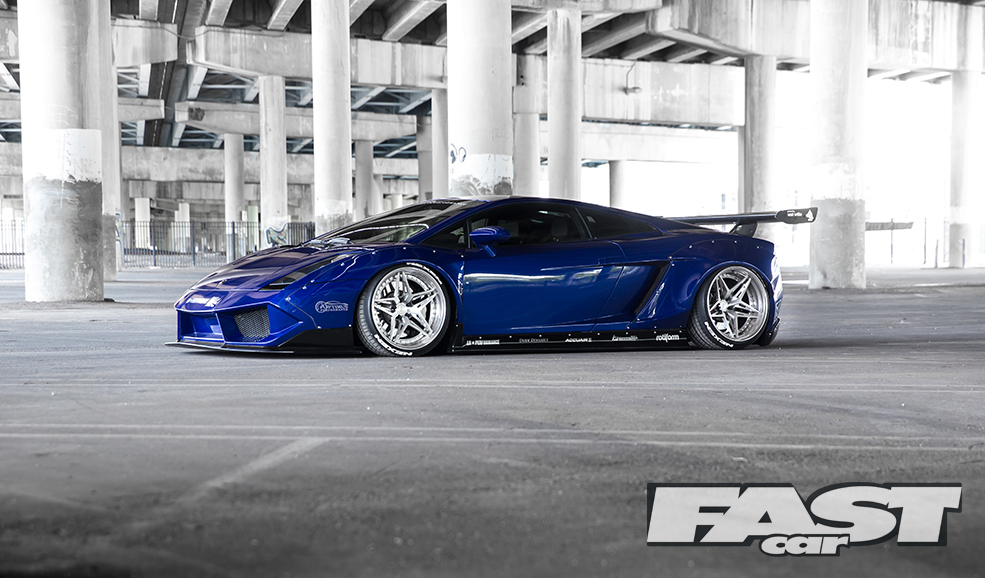 You’ve guessed already, haven’t you Sherlock? It’s the car you see here: a Lamborghini Gallardo. That’s right, they’re pimpin’ supercars now. And in true F&F style, this is no ordinary Gallardo – the mid-engined V10 rocketship is now rocking twin turbos, air-ride, custom Rotiform prototypes, and more sprinkles of stardust than your earthly perceptions can comfortably cope with. We’re through the looking glass here, people. The Mad Hatter’s sprinkled LSD in your tea and you’re seeing weird blue shapes.