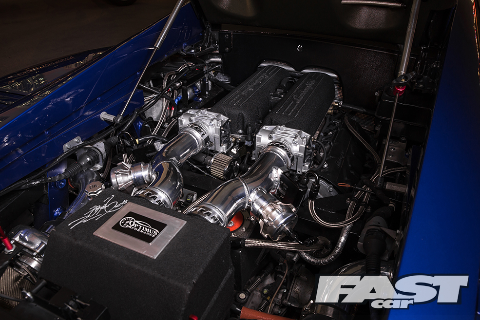 5.0-litre 90-degree V10, custom Optimus Performance twin-turbo setup with Comp