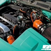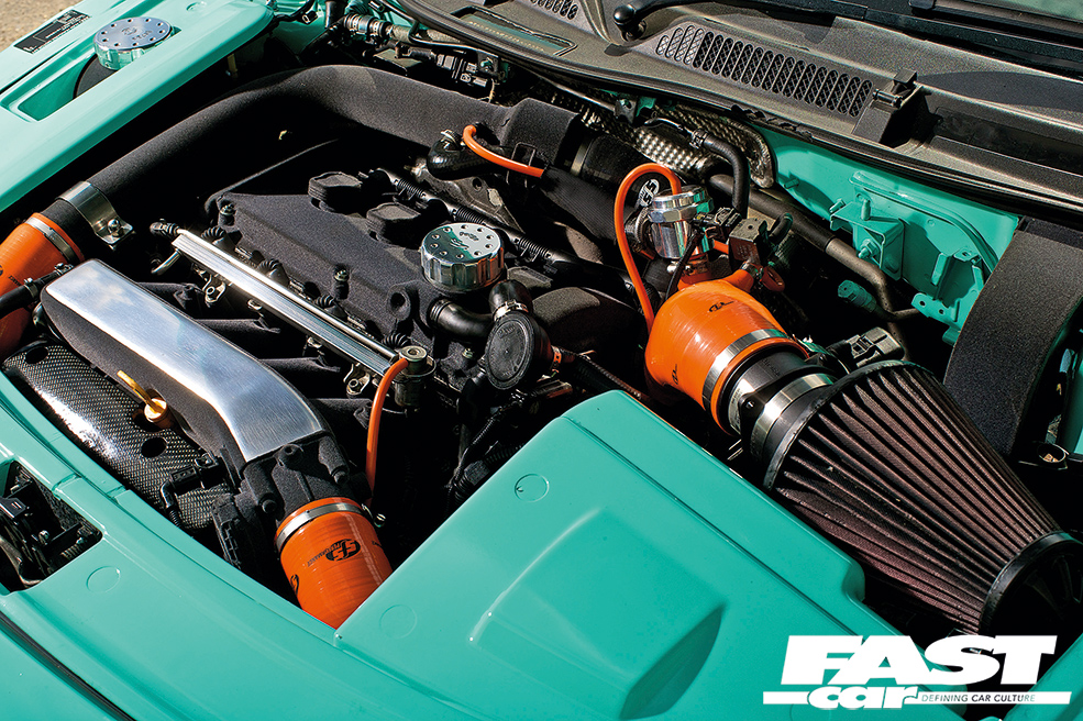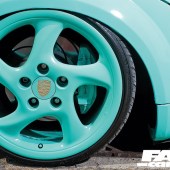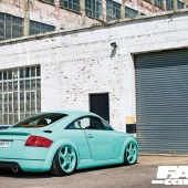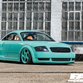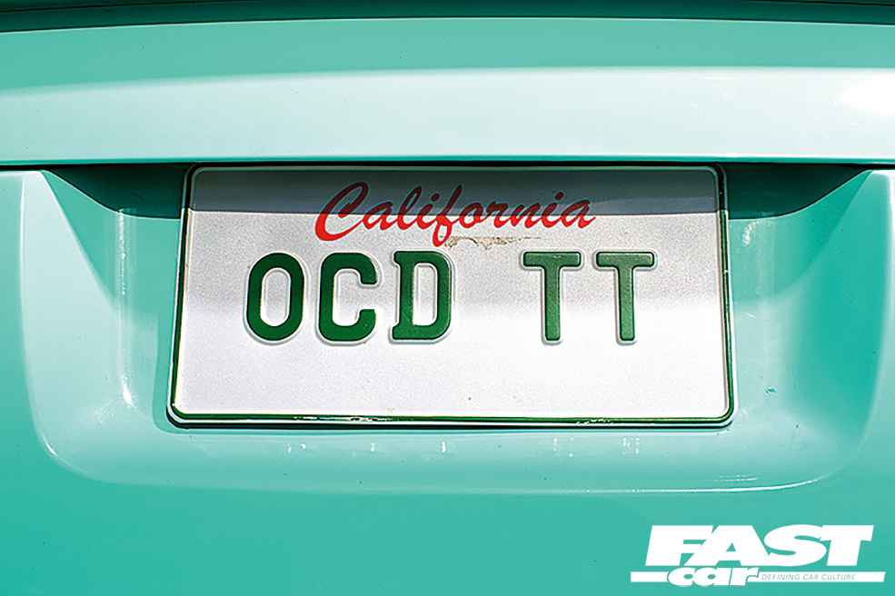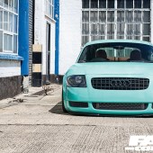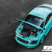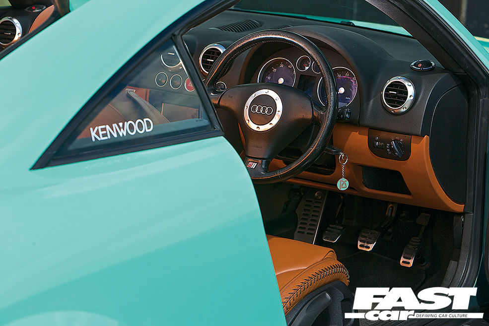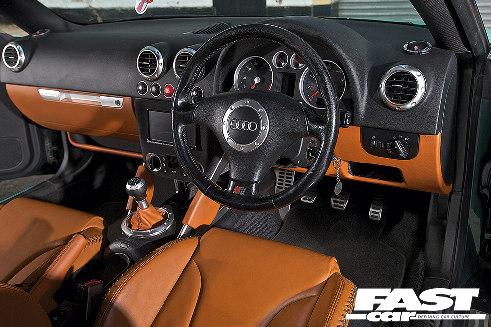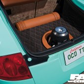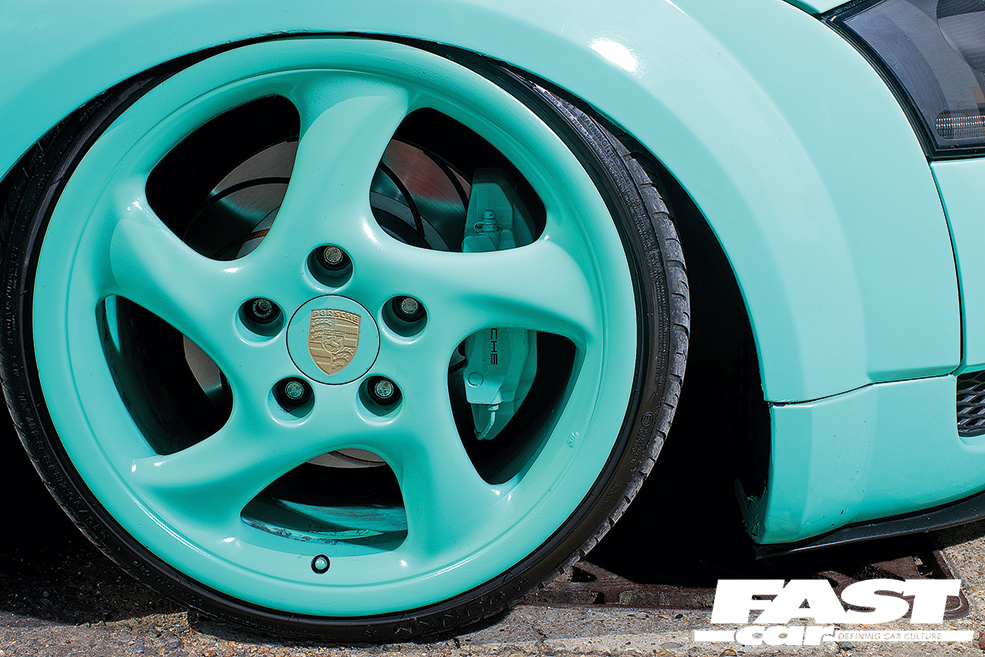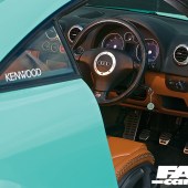 The plate recess on the back has been shortened to take a US spec plate which has given the arse end a much neater look. The car was then handed over to the lads at Essex Vehicle Wraps who have covered it from front to back in a mint green vinyl which looks good enough to lick! To finish it off a set of 8.5x18in Porsche ‘Twist’ wheels were painted mint green to match the body and fitted up to the car. The Porsche goodies don’t end there though. A set of Boxster front 4-pot brakes replace the standard TT parts and have been combined with grooved brake discs for some extra stopping power.
