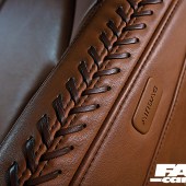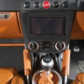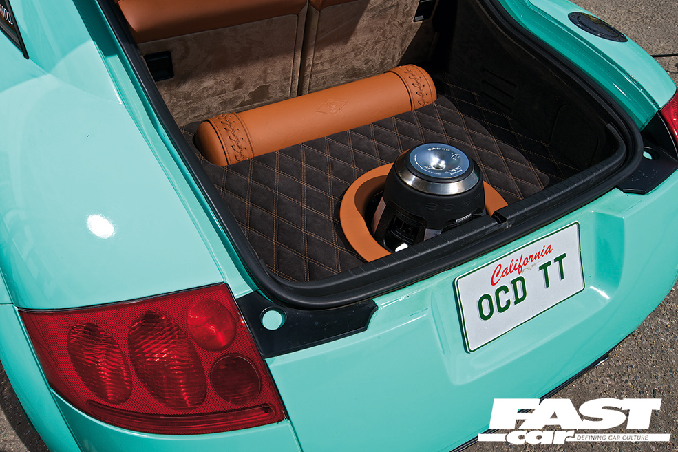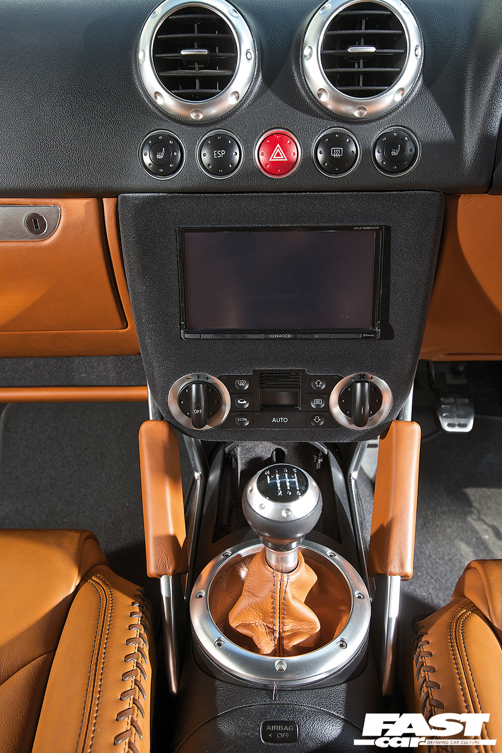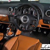 Tan leather Audi TT Mk2 seats, baseball stitched rear bench, under dash, doorcards, gear and handbrake gaiters, knee protectors, air-tank and sub ring, boot install floor re-trimmed in charcoal Alcantara with tan cross-stitching; flocked custom made centre console to accommodate double-DIN headunit
