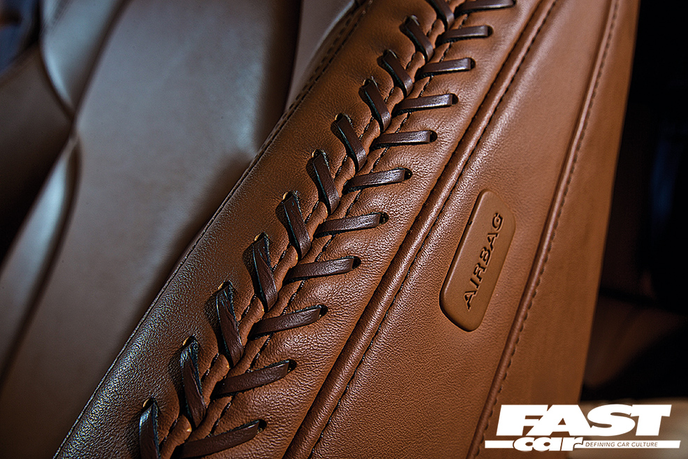 The airtank has also been trimmed with the same tan and baseball stitching as the rest of the interior and sunk into the boot along with an inverted VIBE Space 12in sub. Sorting out the rest of the tunes is a full VIBE set up consisting of 6.5in Black Death front and rear components and a 5-channel amp. The brains behind the bass is an ultra-smart Kenwood double-DIN that comes with built in sat nav, iPhone connectivity and loads of other cool features.