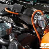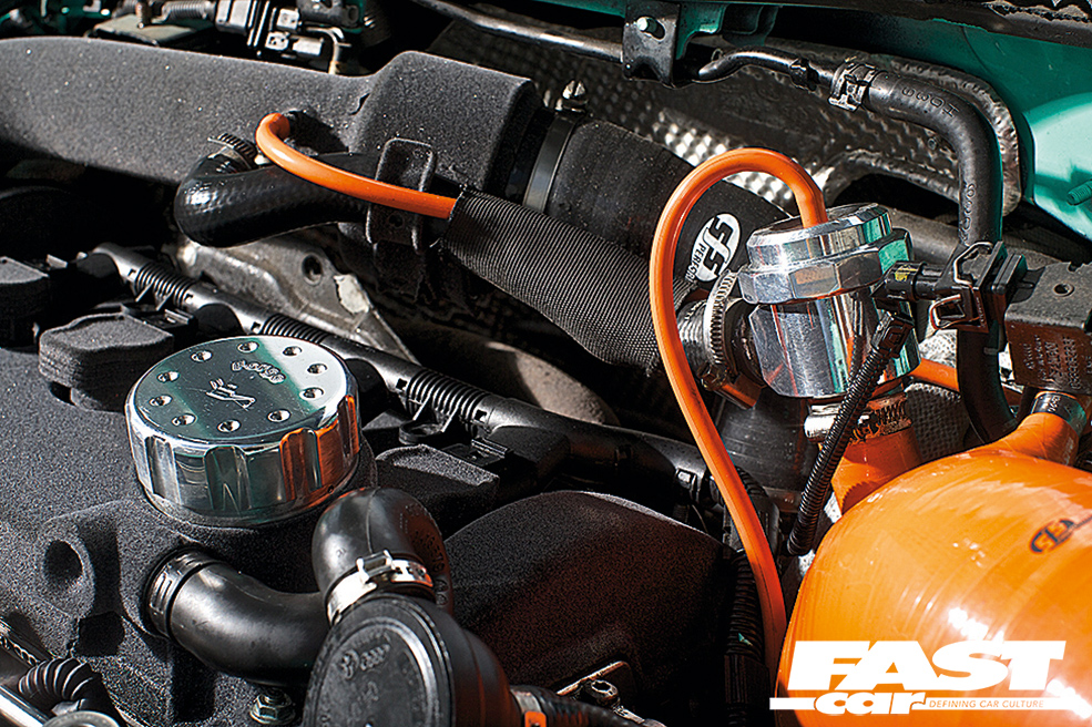 EMP performance 3in turbo back stainless mandrel bent exhaust system, stainless mandrel bent FMIC pipework; Toyo Sports large FMIC; SFS orange boost hoses, 3in TIP intake pipe, orange vac lines, G-werks Stage 1 remap, S2000 K&N air filter, Forge polished oil and water caps, 007p DV, 1.8 20v non turbo smooth rocker cover, 2.0l TFSI coil pack conduit, N294 valve removed, carbon canister removed, throttle body blocked off, wire-tucked fuel rail, polished fuel rail, charge pipe, inlet manifold, rocker cover, coil packs, coolant bottle, wiring harness cover all flocked in grey sparkle, carbon manifold cover