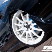 D2 racing coilovers; front and rear strut braces; uprated OMP anti roll bars front and rear and drop links; anti lift kit; uprated alloy lower arms; Quick Rack steering rack; Prodrive Alcon 4pot callipers with 330mm discs and Redstuff pads front, Redstuff pads rear; 8x18inch Team Dynamics Pro Race 1.2s; 215/35×18 Toyo Proxes tyres.