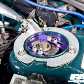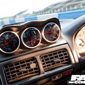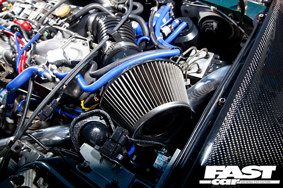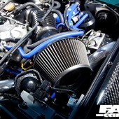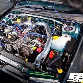 1998cc 4 cylinder turbo; Blitz front mount intercooler, Blitz induction kit, Blitz dump valve, RCM lightweight pulleys, 3-inch Blitz Nur Spec full exhaust system; Simtech ECU; bigger injectors; anti lag launch control; uprated boost control valve; factory fitted 5 speed manual with B&M quick shift and Exedy paddle clutch.