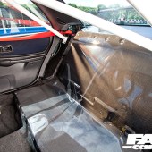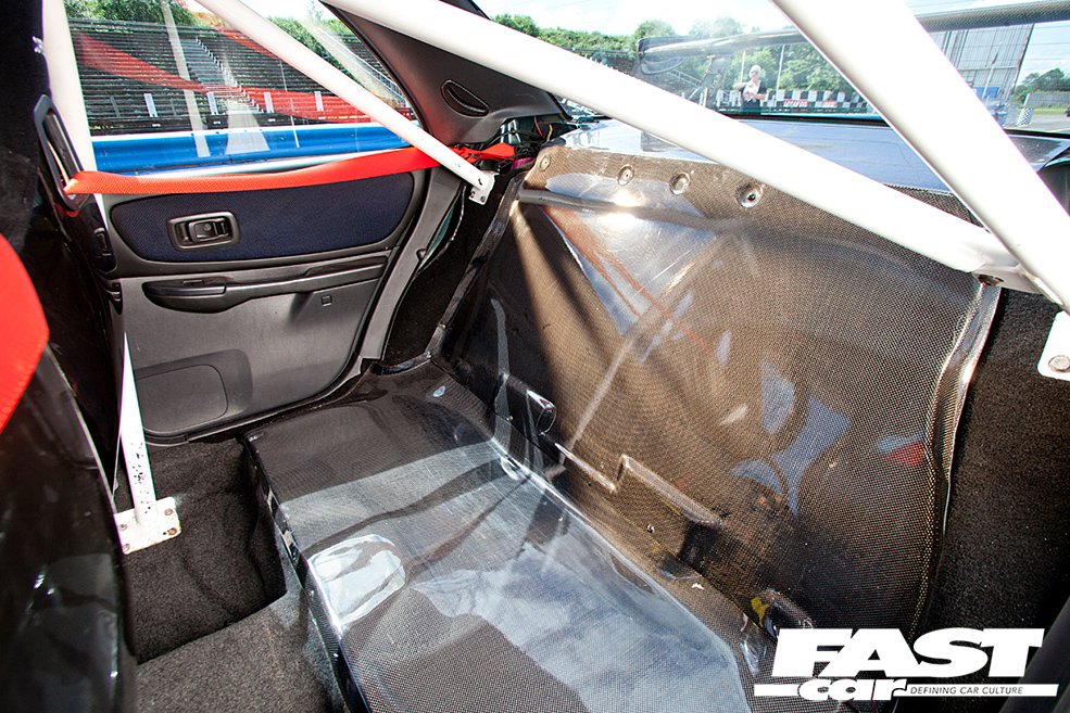 Carbon fibre Corbeau Revolution bucket seats; TRS 4-point harnesses; 6-point Cusco rollcage; OMP deep dish steering wheel; 3x dash mounted DEFI gauges; carbon fibre rear bulk head.