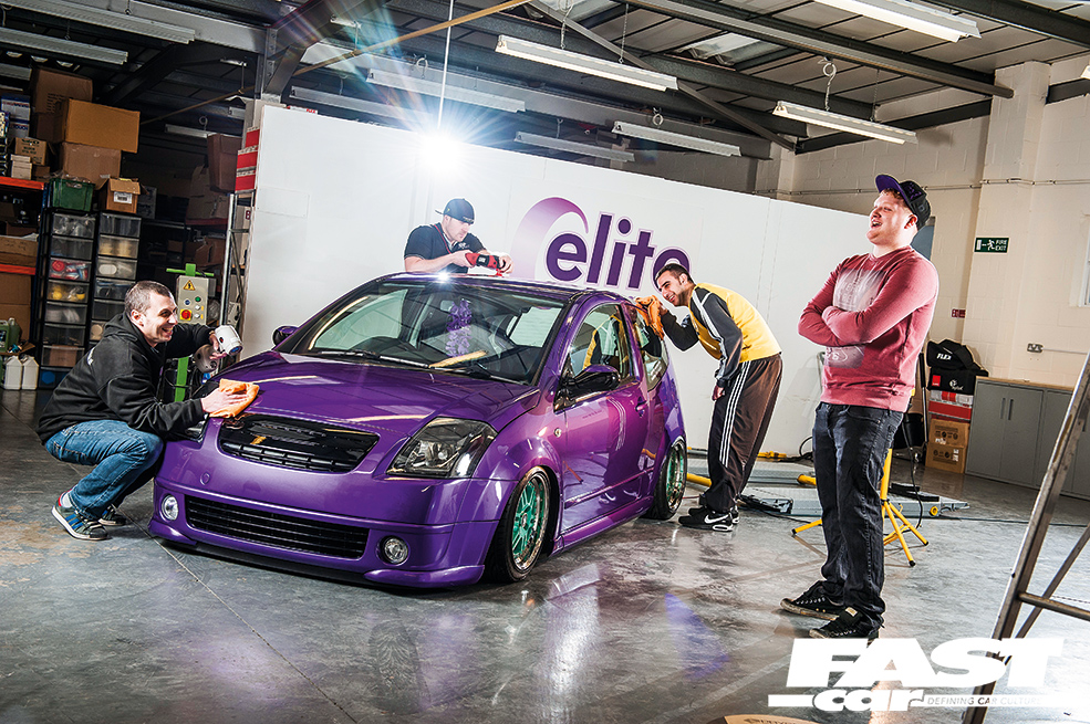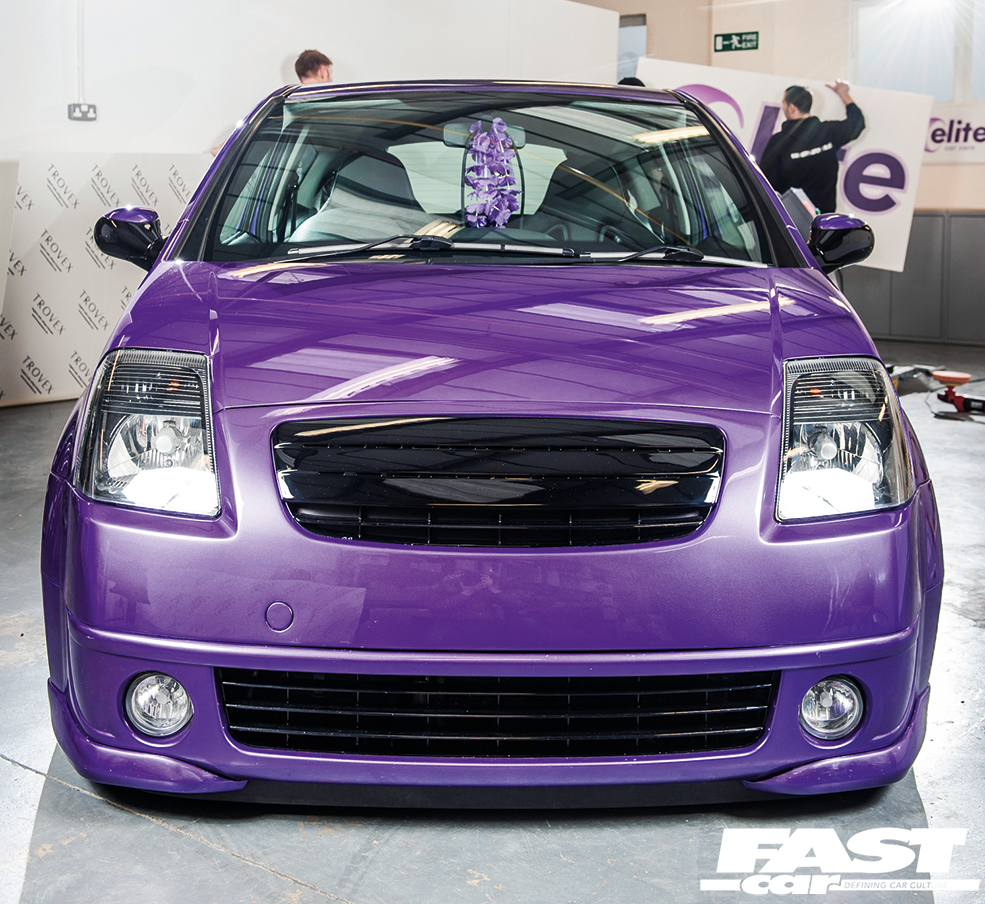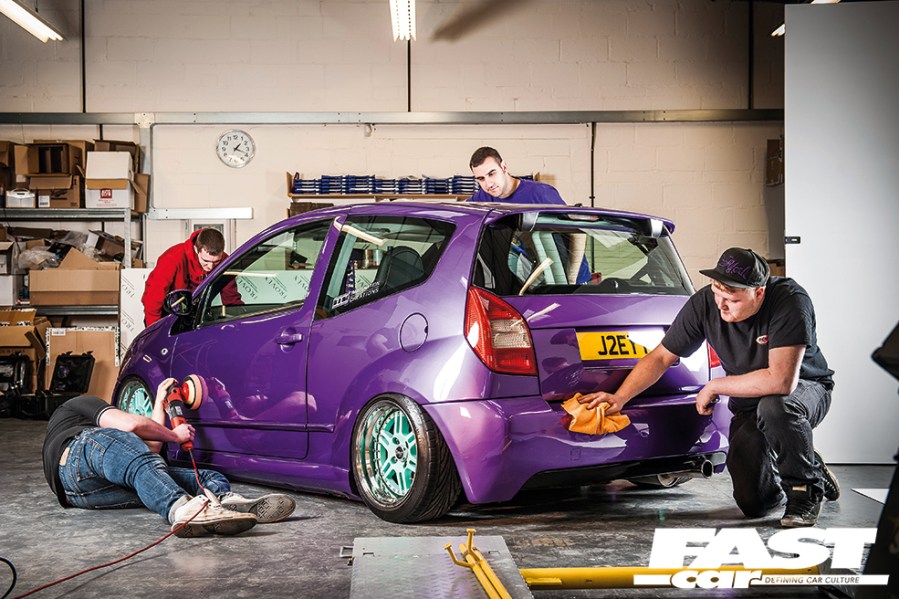 Local bodyshop Imagination Creations were put in charge of sorting the Citroen’s shell. The front bumper has been fully smoothed, together with the rear to give it a clean and uncluttered finish. The boys have also worked their magic on the boot and deleted the aerial. At the same time all the badges were removed and a de-badged grille was fitted. With all the panels up to scratch it was time for Joe to pick a colour to dress the C2 in.