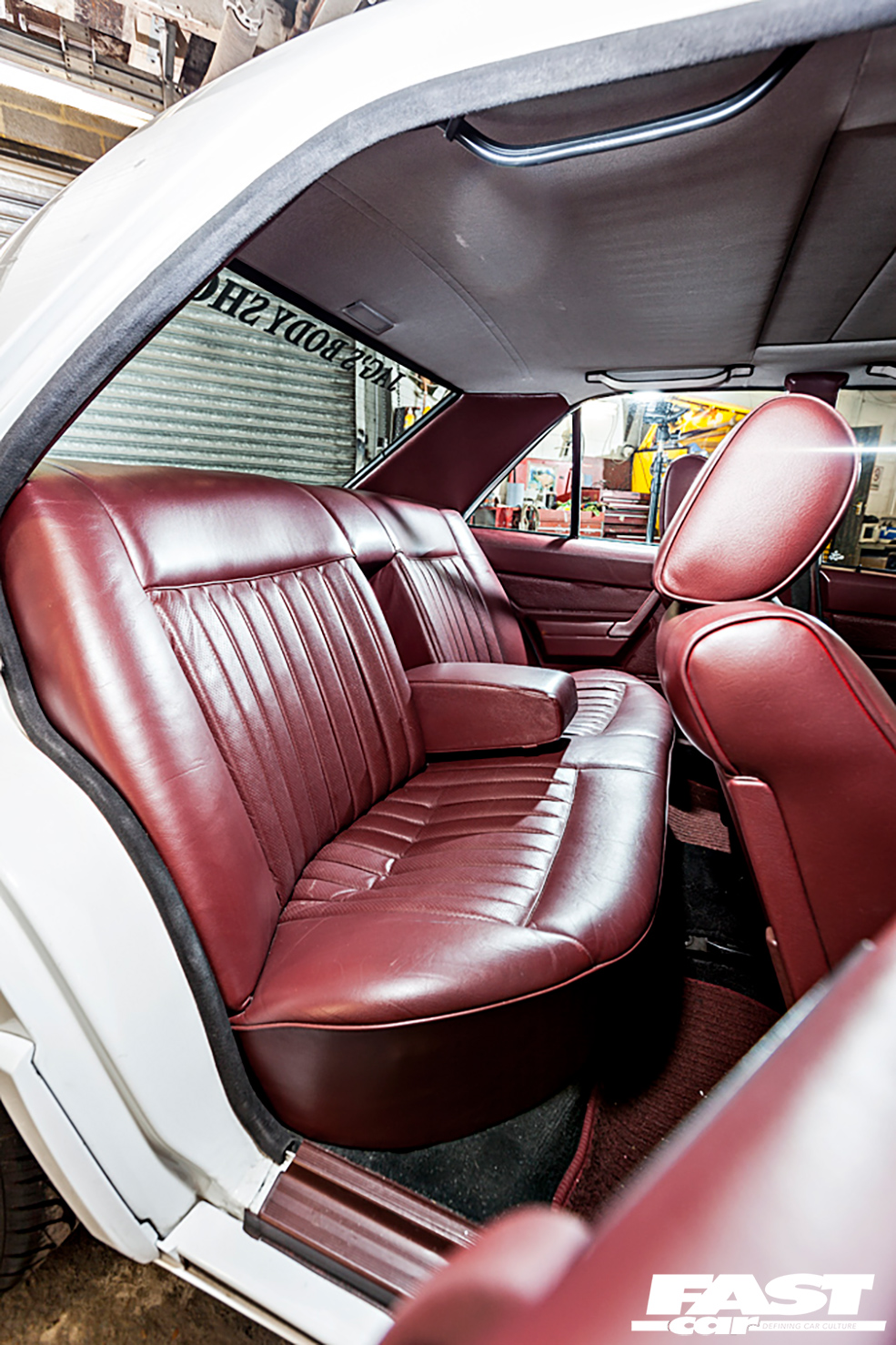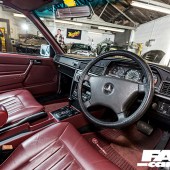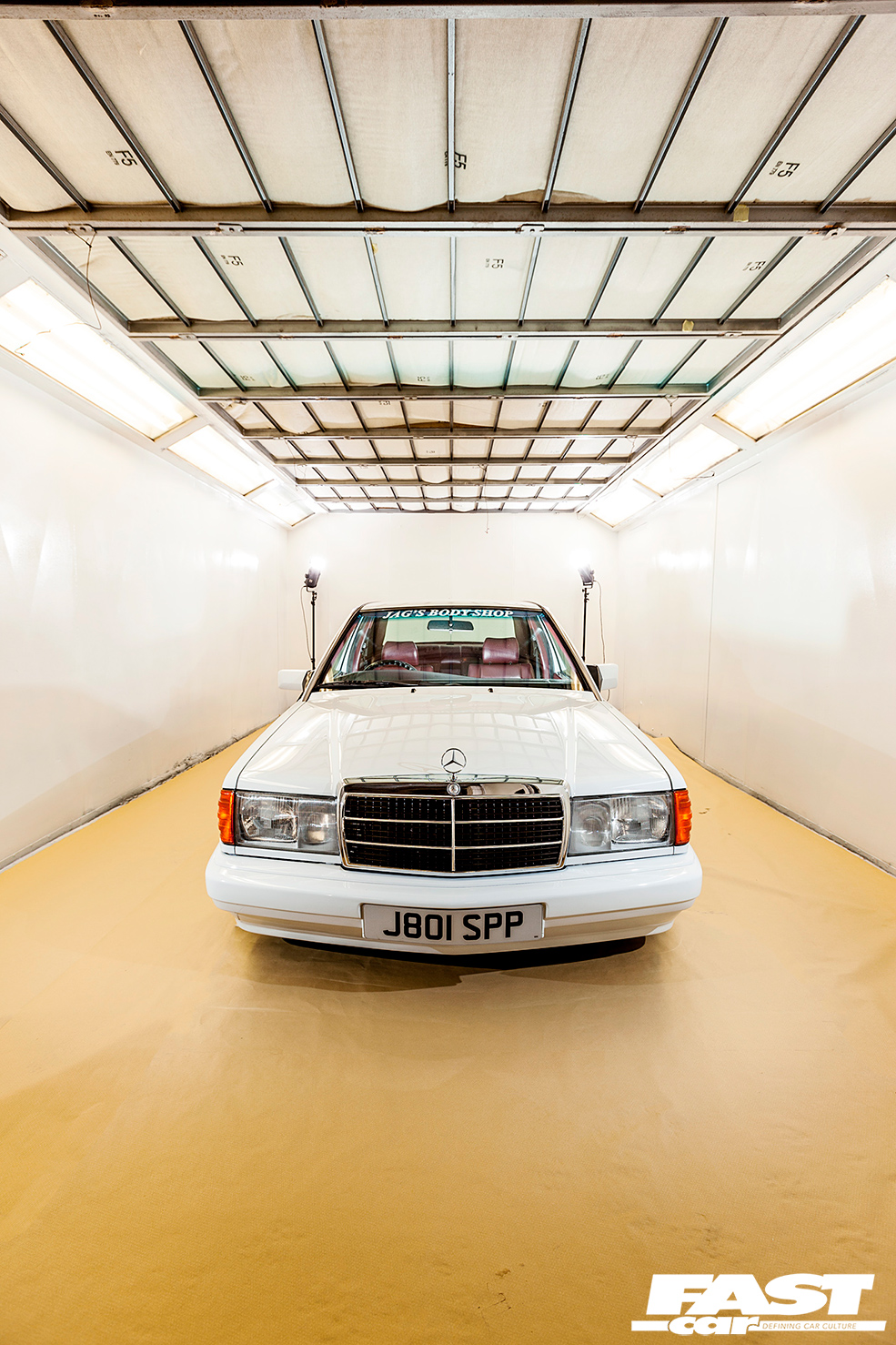 The first port of call was to get that tired old bodywork put right. The car was rolled into Jags Bodyshop to have all the panels straightened and tidied up. Wanting to keep the body fairly standard, James opted to go for a full respray in the original Mercedes white. At the same time, the side repeaters and aerial were deleted, along with a touch of smoothing on the bumpers. The old badges and grilles had seen better days, so a new set were ordered and fitted to give the car a factory fresh finish.