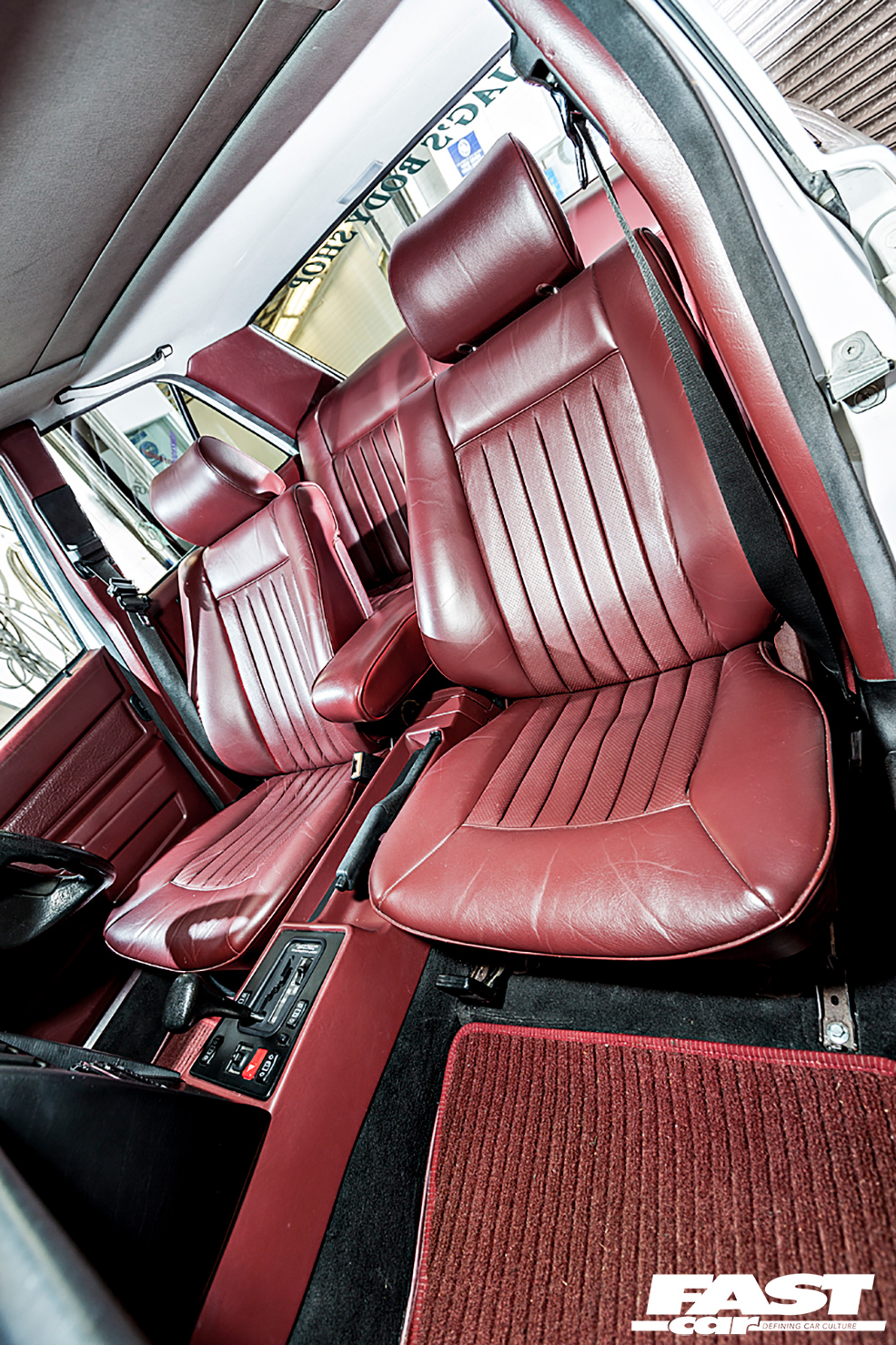 With the exterior up to scratch, James focused on sorting out the nasty old insides. The whole lot was stripped out and binned, before a full Oxblood leather interior was modified and fitted. The old carpet was taken up and dyed black to give it a new lease of life. A simple Pioneer headunit and uprated components fill the cockpit with the sweet symphony of soul.