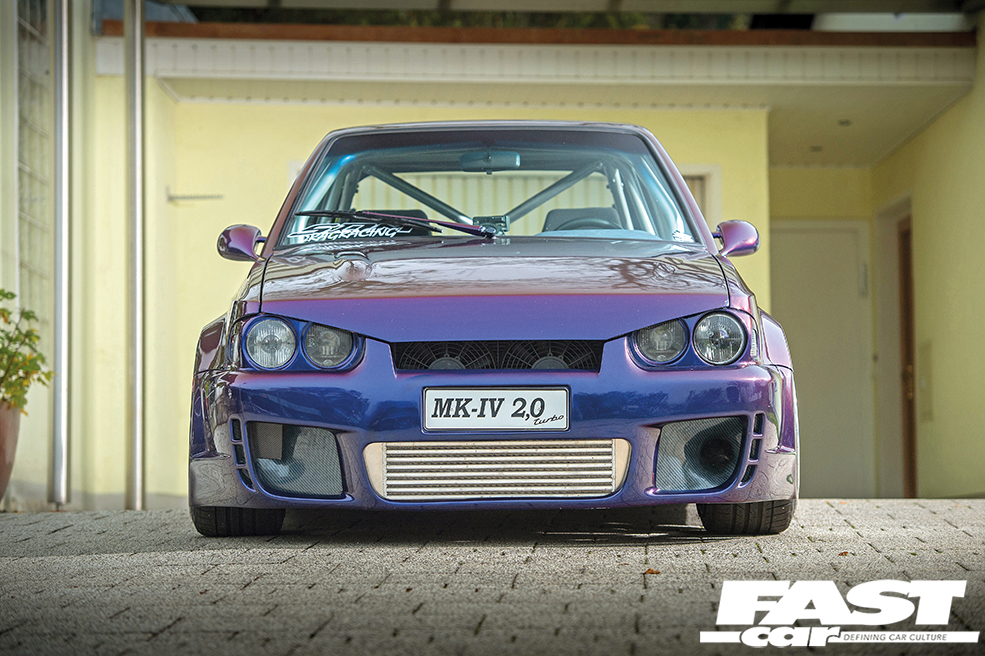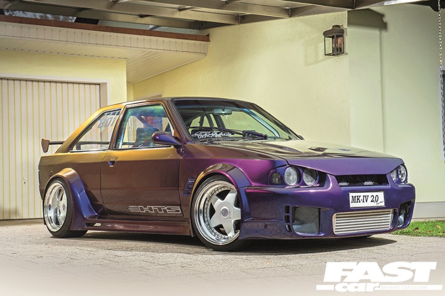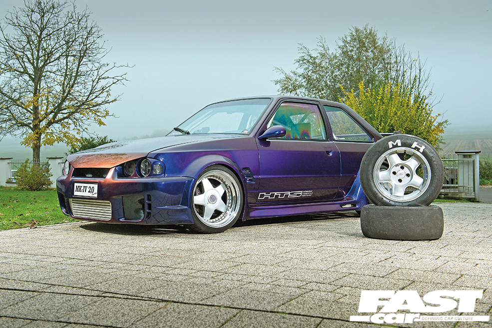That is a seriously impressive achievement, so it’s no surprise that Dirk’s spannering skills are being put to use not only by customers through his business HTS Racing Parts (on Facebook), but by his own family too. “My wife Doreen is also interested in tuning,” exclaims Dirk, “she has a tuned Escort convertible with RS2000 turbo power and my fourteen-year-old son Justin is building up a Honda Civic for drag racing at the moment…we are a car fanatic family so to say!” Indeed, the whole family travels to car shows and drag racing events with Dirk and they give him amazing support – he even proposed to Doreen at a Ford meeting on the event stage (and they say romance is dead!). In these days of online car parts and chequebook builds, it’s great that we still have such ingenuity, passion and individuality being passed down through the generations. It‘s lovely to see there are still mad Ford professors, beavering away in their garages and sheds and turning out completely one-off projects with ideas that are not only unique, but are devastatingly effective. All this, in what is still a streetable car which you don’t expect for one minute to have the ‘go’ to match the ‘show’! So if you’re a Veyron, P1, or LaFerrari driver and you pull up against a purple Escort with a ‘Bad Boy’ bonnet and M3 door mirrors don’t be fooled – as all is not always as it may seem…!
