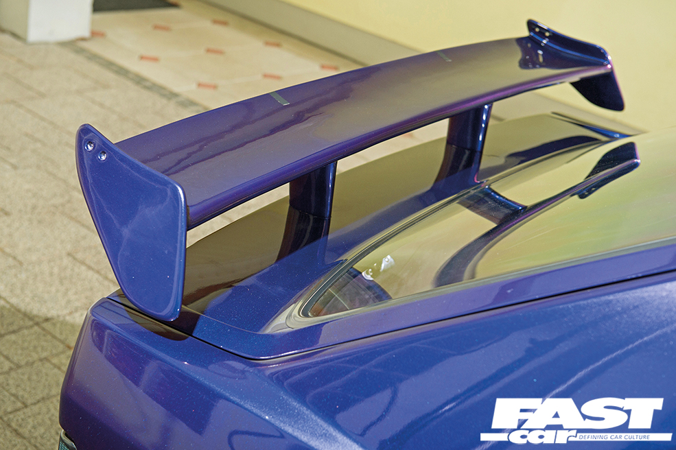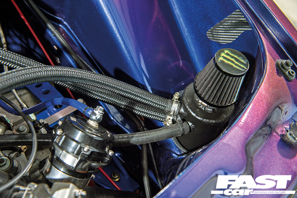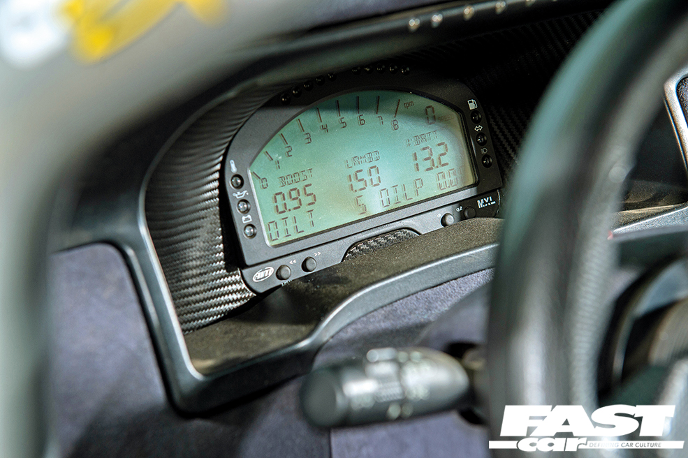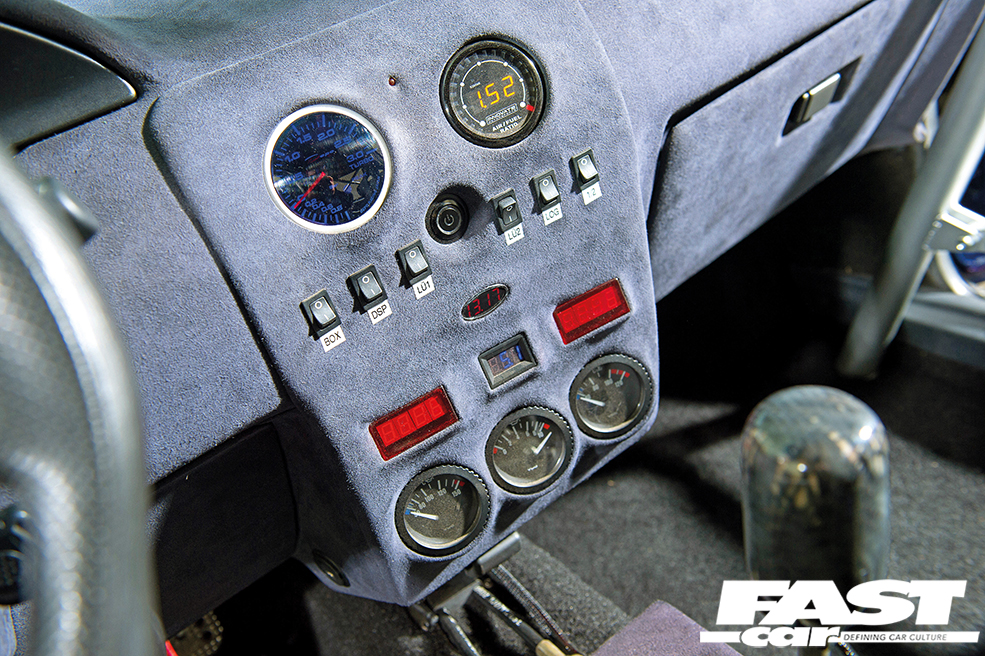 As the engine evolved from street blaster to quarter mile racer, the bodywork and interior also evolved from show car to something more serious, with all of the design and build crafted by Dirk’s own fair hands. The engine was forged, the bodywork received wide arches to take fat rubber and the interior was switched from luxurious beige leather to the Alcantara-clad Clubsport style cockpit you see in the pictures today, complete with bucket seats and a plethora of gauges.