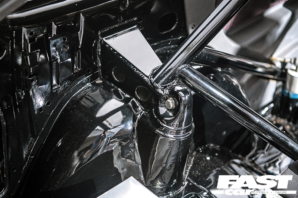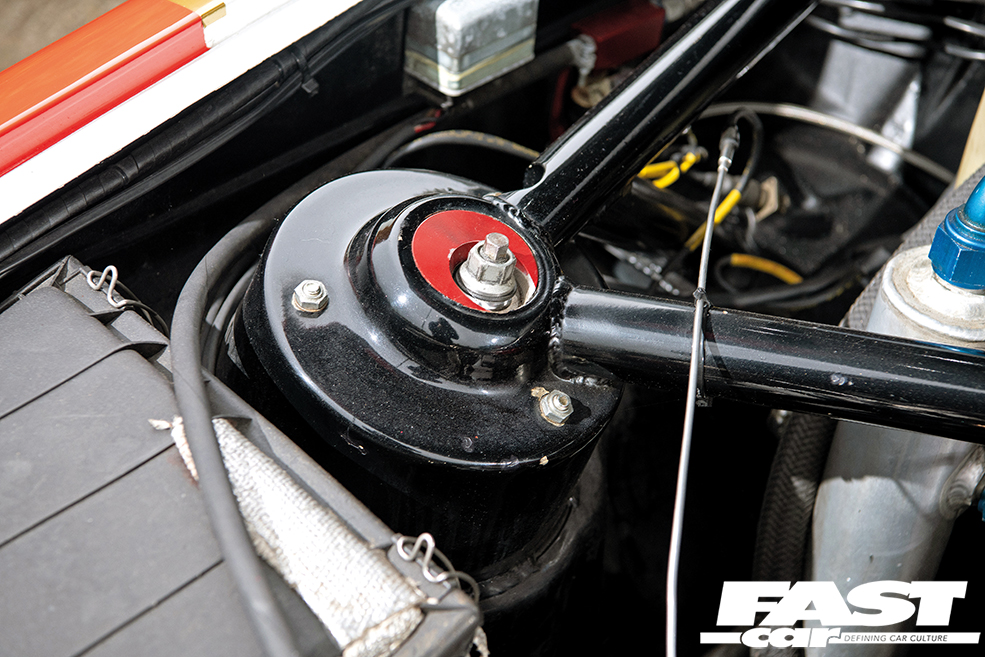 Front: Bilstein Group A dampers with Eibach springs, Eggenberger-spec uprights and spindles (different from Rouse-spec), compression struts, adjustable TCAs, Eggenberger (non-bladed) steel front anti-roll bar, Eggenberger top mounts, non-power steering quick-ratio steering rack with Eggenberger-modified steering arms; rear: solid-mounted modified beam, Eggenberger-spec aluminium rear arms, Eggenberger spindles, Bilstein dampers with Eibach springs, Group A-spec anti-roll bar; fully rose-jointed throughout