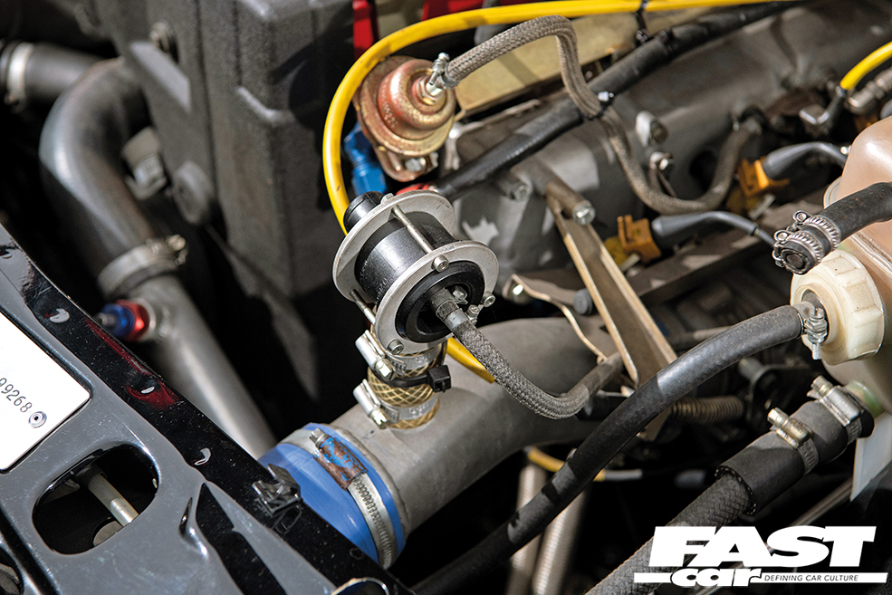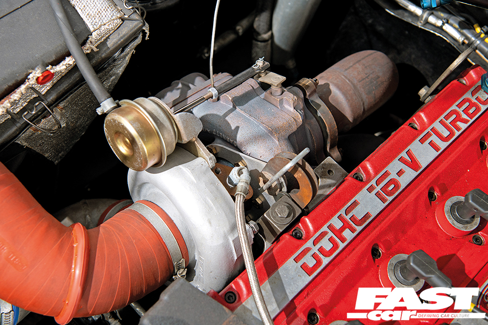 1993cc YBD, Eggenberger-spec Group A engine, RS500 205 ‘small core plug’ block, original rods and crank, Eggenberger-spec pistons, RS500 inlet with twin fuel rails but only running four Porsche 1200cc injectors (four ‘yellow’ Bosch injectors fitted in second fuel rail but not active), ported head to Group A regs, original valve sizes, Eggenberger-spec cams, side-exit exhaust, RS500 intercooler, twin engine oil coolers, Bosch 1.7 ECU with Eggenberger mapping, adjustable boost switch hidden behind ECU cover on dash, full copper wiring loom.