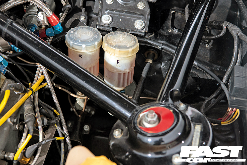 Group A-spec Getrag five- speed with dog-leg first gear, Eggenberger-spec 7.5in ZF rear diff with spool, Group A two-piece propshaft and Group A driveshafts, cable-operated paddle clutch